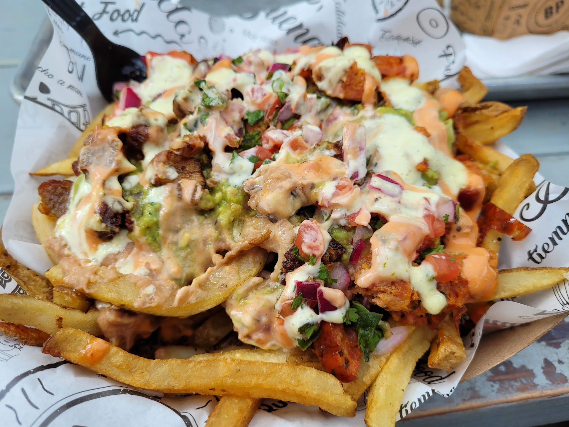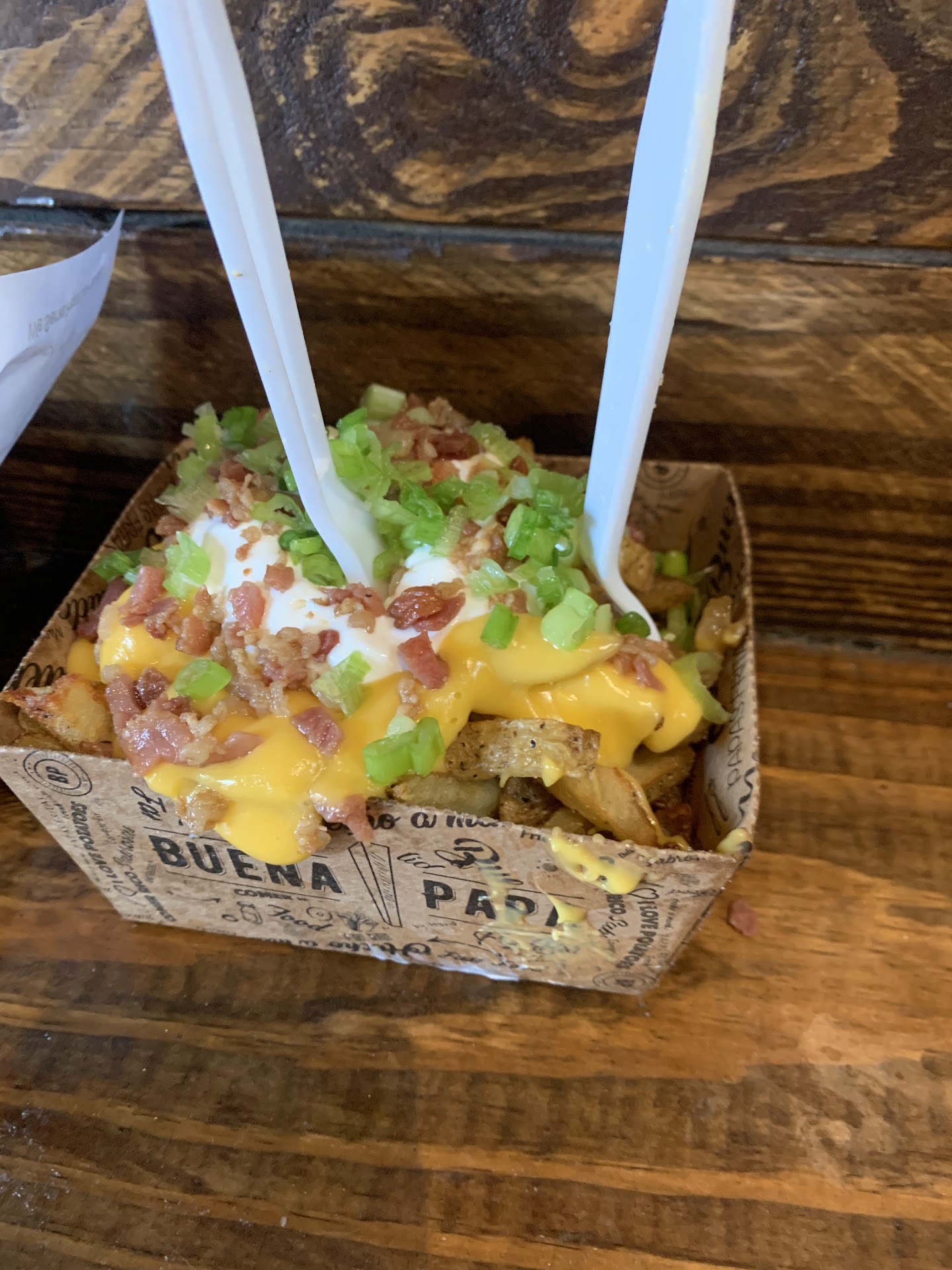 Good portion size of fries but the toppings are only on top. Should “spread” out the toppings like a flat tray of nachos. It was tasty and I’m glad we got them but I would not wait in line for them again. Service at this location was not good. Giving them 3 out of 5 because they just opened. Would have given 2 out of 5 if not. The food hall was slammed, my girlfriend was able to order at two different locations before I ordered here. More detail.