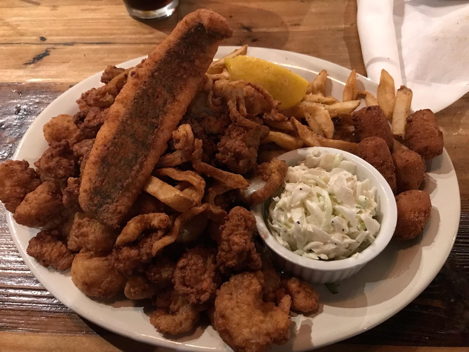 *I added a picture of another person in my parties plate. They ordered the Whole Boat. I don't know if you can tell but all the Seafood is over fried. It came out luke warm.. The hush puppies were hard as a rock. This is a $30 plate.