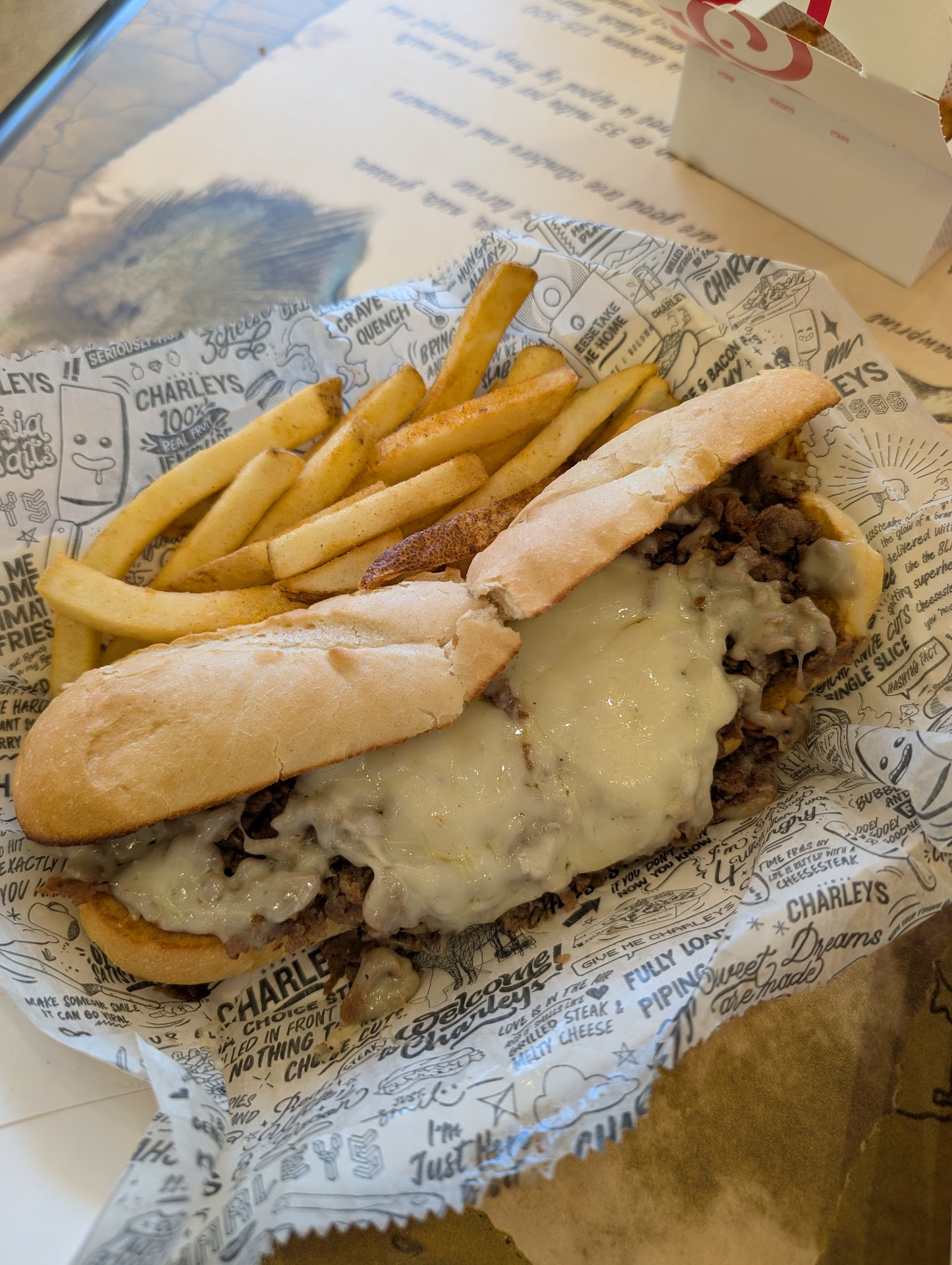 Read moreWaited years to go back to a Charley's. Finally went today. Ordered ahead. Paid for four sandwiches, two of which were supposed to be large. When we got there they said they were out of large buns. We asked for a refund on the two sandwiches for the difference in price and she said that it wasn't worth the effort to give us the money back. One of these sandwiches were supposed to be a BBQ with crispy onions and we paid for bacon to be added. We received No BBQ, raw onions and no bacon. Another was a chicken california. This was ordered as normal but the sandwich we got had no onions, no lettuce or tomato like it was supposed too. The last one was a chicken Philly to split between my two kids. There were burnt pieces of chicken and mushrooms throughout it. We had to toss half of it. We spent 56 dollars on garbage. Also it had whatever the hell this...