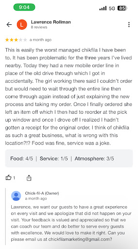 Ā Ā Ā Read moreI can see from the multiple other customers reviewing this location that my terrible experience is not unique to just meā¦thatās sad.. The hope would be that when your customers give feedback, you as an operator would adjust to ensure your customers are highly satisfied! I love Chick-fil-aā¦I have 5 kids, so you can imagine the money I invest in this great company⦠Today, I visited the location on Six Forks Rd. There were two lanes and I mistakenly chose the āmobile appā lane. There were 6 or 7 vehicles waiting for food and ZERO vehicles waiting to order in either lane. Two employees were standing in the other lane but neither even looked at me to get my order. When I rolled my window down and asked them to take my order they stated I would have to drive around to the other lane before they would serve me. I would have to wait behind the others in line, drive all the way around and then I could be served. I questioned this as NOBODY was in either laneā¦āI donāt make the rulesā was the young ladies response when I pointed out the stupidity of what she was saying (as she is leaning in my window with her device). I pulled forward and reversed into the ācorrect laneā and she took my order as if I had not just had this incredibly unpleasant conversation with her 15 seconds before. I spoke to the manager, Nate, and he said āhe understood my frustration, but the operator had made the rules.ā Here is my issue: 1: Empower your employees to make situational decisions to ensure a WOW customer experience. 2: Have flexibility to accommodate customers who mistakenly enter the incorrect line, or solution something so that customers are not inconvenienced and employees put into a difficult situation when customers enter the wrong lane. 3: LISTEN to your customersā¦They are telling you what the issues areā¦if youāll listen your reviews will improve and customer satisfaction will improve! 4: MY PLEASURE is not just a catch phrase, itās a culture at Chick-fil-a and should extend through the entire customers journey, not just after taking...