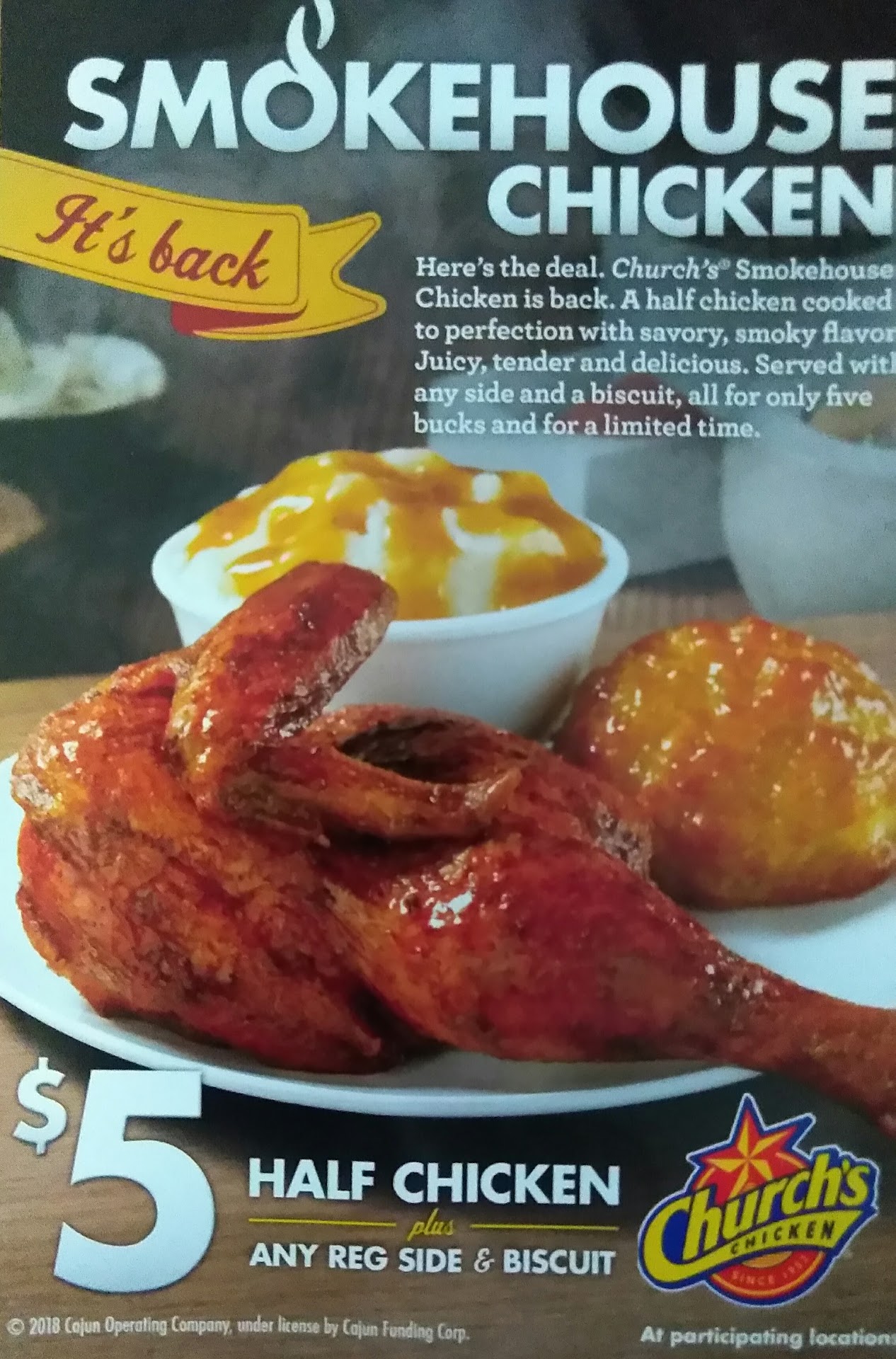 The cook had his area stocked with more chicken that I've ever seen before in any churches restaurant even from the time when I used to work at a Church's Chicken 30 some years ago in Durham. I noticed that they had a new item on the menu called, "Smokehouse Chicken" which in all my years of patronizing this chain, I had never tasted this type of chicken from a Church's franchise or anyother fast food restaurant. It was also competitively priced at $5.00 and it includes an half of a chicken (4 pieces), an individual side of your choice and a biscuit. For an dollar extra, you could get a medium sized drink.
