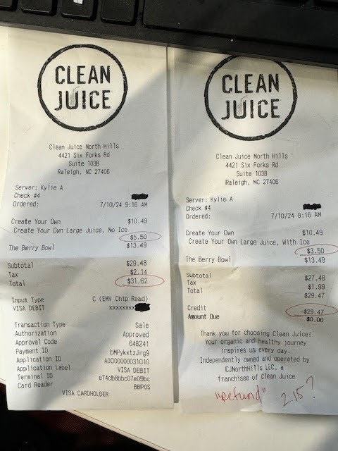 Given this unsatisfactory visit, I am seeking a response from the owner or district manager of Clean Juice NH for a full refund and an explanation regarding the misleading charges and lack of transparency. Unfortunately, based on this experience, I have no intention of patronizing Clean Juice NH in the future.