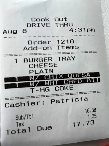 Read moreToday, I went out to the Cook Out to order my Chicken Strips Tray with Regular Fries and Cole Slaw with a Double Chocolate Oreo Milkshake. When my order was $6.77, I gave the young man a $20 bill and he gave me back $13.23 worth some change, which was good cashier service. But when the same young man asked me if I wanted any sauce with my chicken and/or French Fries and I told him I just wanted three honey mustards because they were good with my tray, whoever the lady manager told him to tell me that they could give me only two just because they are charging 25 cents for an extra was out of line. That right there was ridiculous. First of all, Dear manager on South Sanders, I've been to the one in Fuquay-Varina, and they never charged me extra just because I asked for three honey mustard packets. As a matter of fact, the next time I come to your place and order some chicken strips tray with fries and slaw and a bottle of water to drink and you think you can charge me extra if I get three honey mustards instead of only two, please miss me on that. Like I said before about the one in Fuquay never charges me extra for any additional sauce. Also, I know Cook Out on Capital Blvd don't charge me extra either. If you think for one second if every other Cook Out is going to start charging the same way as your business is, buddy please think again. Otherwise, watch me what I can do with the so-called limited packs with my meal tray. Now if you want me to go on with my life, then you might as well forget about charging every customer for an additional amount of sauce package they ask for because we're not paying for it if that's what you think. I know you have a whole lot a customers go there to get something to eat. Trust me, I've been there one Wednesday night last month and your parking lot and drive-thru were overflowing. So why don't you all use plenty of money you make and buy you some more sauces if you need to, or else you might as well charge yourselves out of business lol.