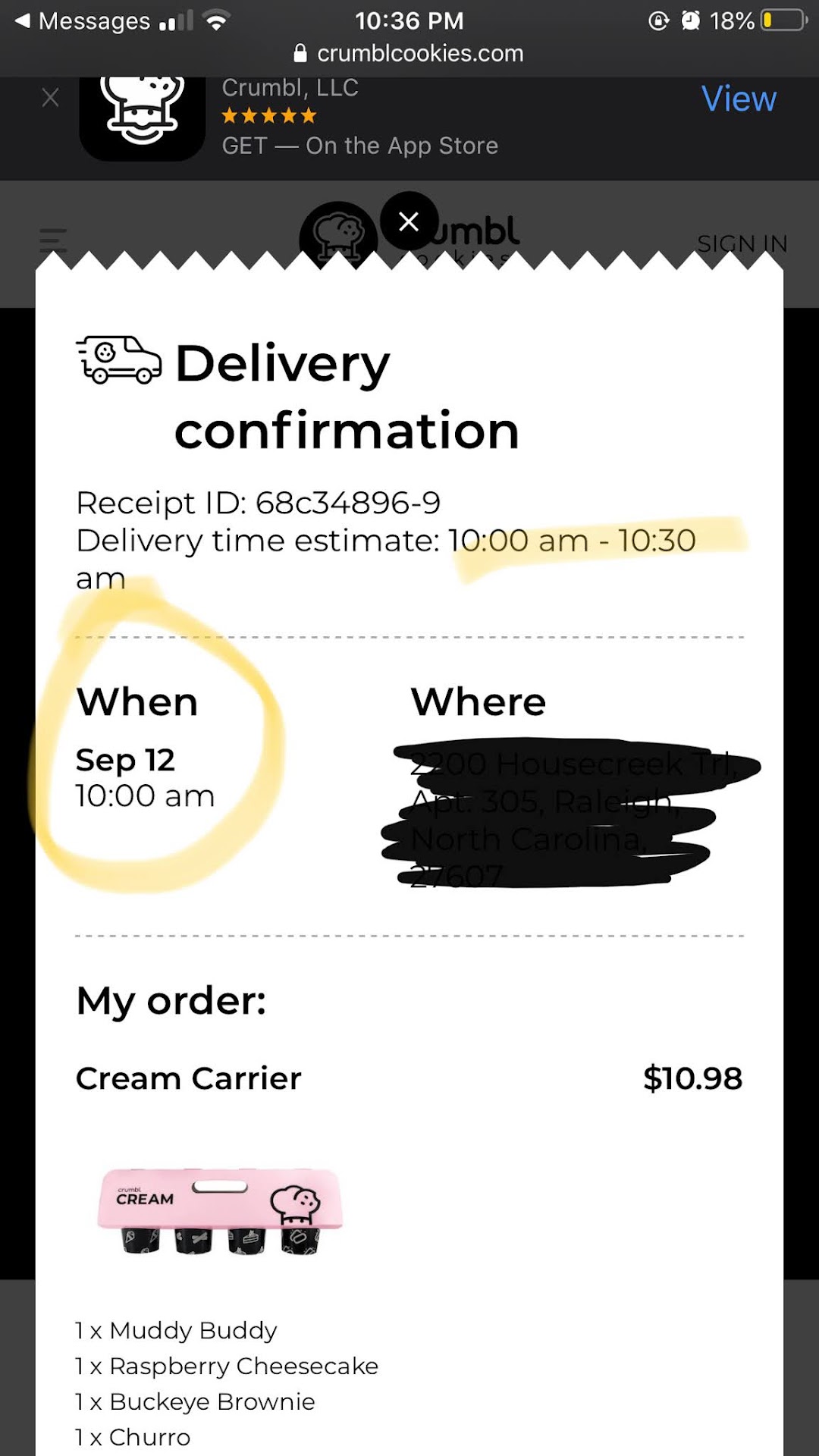 Read moreI never make reviews but this was by far the worst customer service I have ever experienced. I made an order tonight for ice cream to be delivered to a friend TOMORROW (9/12) at 10 am. I get a text tonight that it will be delivered at 10:37 tonight. I called to see why this was and the employee (Jordan) tells me that the order is for tonight. I told her that was incorrect but she kept saying it wasn't. She asks if I want to cancel and re-order for it to be delivered tomorrow. The DoorDash employee then comes into the store and I can hear Jordan talking to him. She tells him that I am canceling the order and that she is sorry. She never once mentions that the error is their fault and instead puts the blame on me. I then get texts and calls from the DoorDash worker asking me why I canceled and I had to explain to him that I clearly ordered for tomorrow and that Crumbl is at fault. Jordan then continued to ask if I wanted to order again now that my "order" for tonight is canceled even though I never had an order for tonight. I did not make another order. This was my first time ordering from this company and I was excited to have ice cream delivered to my friend for her birthday. I would not recommend this place. Below is a picture of my receipt that shows I clearly ordered the ice cream for tomorrow (9/12) not tonight (9/11). There is also a confirmation from DoorDash that said they would be delivering tonight (9/11) at 10:37 pm and the total says $100 when my order was $10.98 before taxes and...