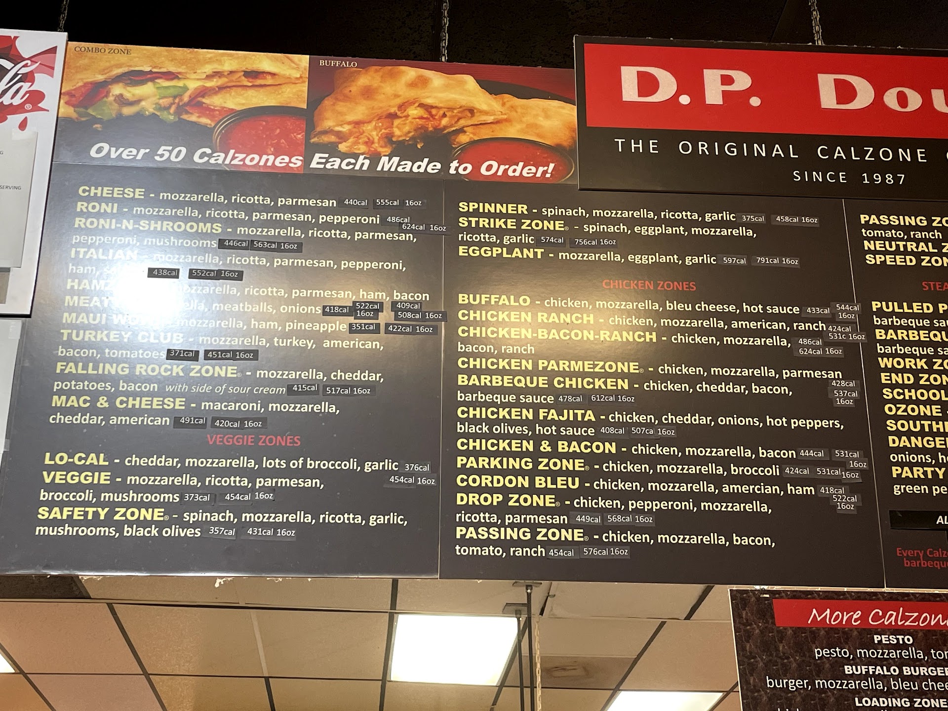 D.P. Dough's menu is quite varied, offering a wide selection of calzones to suit all tastes. Whether you're a meat lover, vegetarian, or looking for a spicy option, there's a calzone for you. Each calzone is generously garnished and wrapped in a crispy golden pastry that's simply irresistible.