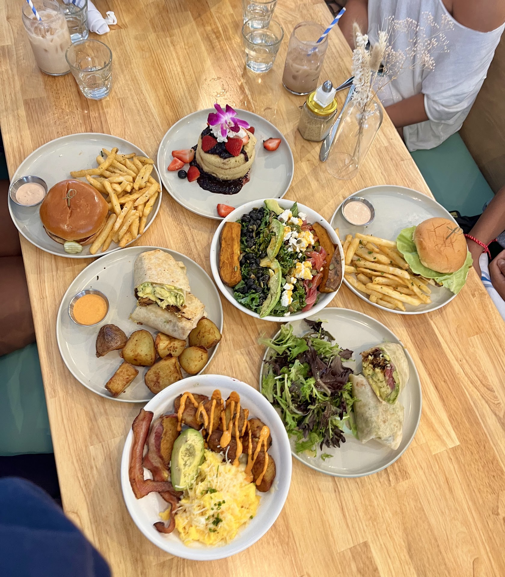 Read moreAfter hearing much excitement about Drift Cafe, I was a bit let down. First of all, it is very loud inside. The space is quite small and they seat a decent amount of people which results in a lot of talking and noise. However, the interior design is very cute and coastal which gives off very beachy vibes. Secondly, the service was not the best. We waited around 40 minutes for our food to come out, and were unable to get a hold on our server during that time. We were only given 1 bottles of water for a table of 8 during our entire waiting period. The server was always around, but it was very hard to get their attention. Finally, for the food! Berry Stack Pancakes - Soft and fluffy pancakes, and the jam was not too sweet. Crispy Potato Brekkie - Large portion and the eggs were delicious and well cooked! However, our potatoes were not crispy at all; only soft. Breakfast Burrito - The burrito itself is delicious and very filling. The pork was seasoned well and the veggies were fresh. The dressed greens were very plain and the dressing tasted almost of nothing. Drift Smashburger - I would definitely prefer going somewhere else for a burger (ie. Five Guys, Shake Shack). It was not bad, but it was quite expensive and you could find cheaper and better tasting options. Overall, in my opinion, Drift Cafe is a bit overpriced and I would only come back for the burritos. I will say that I am not a coffee person though, so I have no input on their...