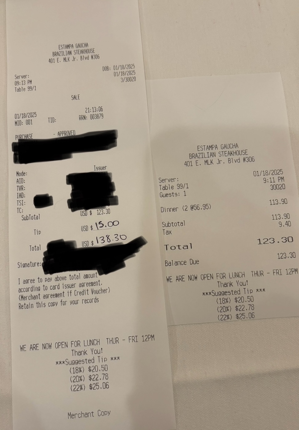 The manager (bald Caucasian man) came over for the first time towards the end of our meal. We told him the food was great but we didn’t have a waitress. He cut me off and said they’re all our waitress as they work together to take care of everyone.. Sure, but we also all know waitresses are assigned dedicated tables. I told him we had to ask for everything we’d received by waitresses we’d stopped/flagged down. He contradicted it by saying we had bread, like that meant we were being cared for. We asked for it.