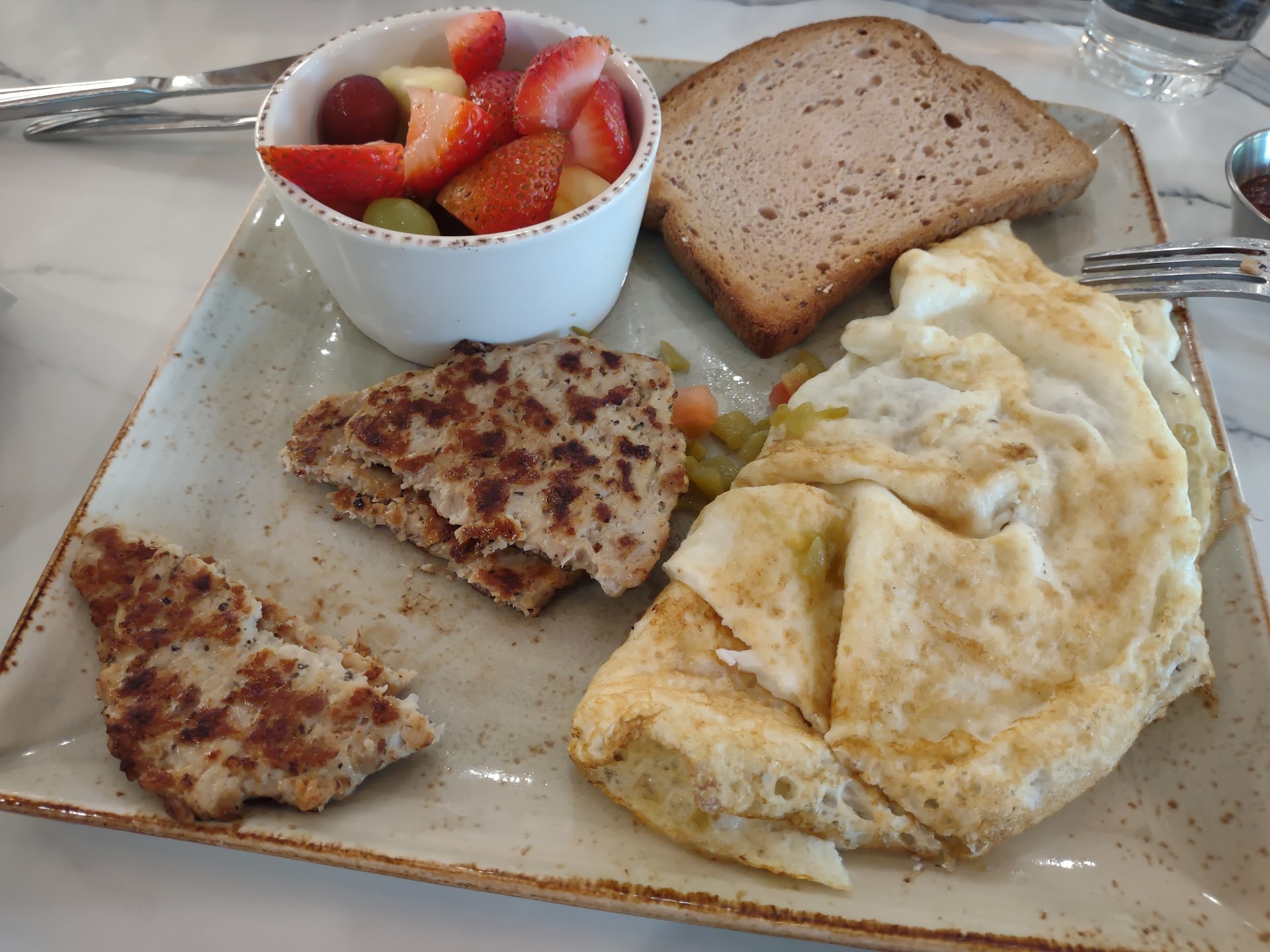 The first plate came out with old-looking fruit, no tomatoes, no toast, no pico, and no mushroomsâhalf the ingredients of the dish were missing. Essentially, it was just an egg white omelette with canned green chili and onions, a few grapes, and the chicken sausage I ordered. I had to call the server over, as she hadnât checked on me. I pointed out the missing items, and she took the dish back to be remade.