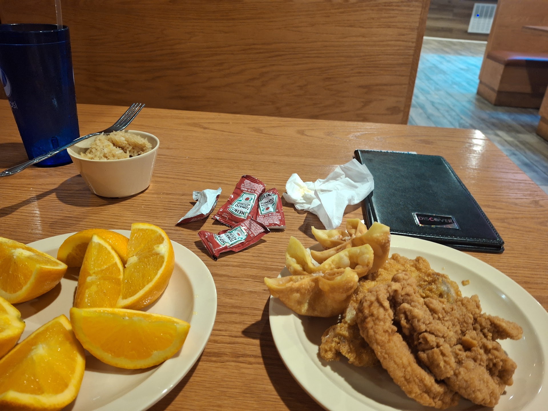 The food at this restaurant was okay coming from the standard bar. Majority of the items were fried, and a combo of crab and shrimp. I can't eat shrimp from allergies, however they had a few other options. The crab Rangoon could've been softer, and fresher. The fried chicken strips had good chicken inside, but the outside fried shell was a little firmer to get into. The catfish was okay, it could've been cooked a little longer, and it had a medium watery texture to it, and I felt it couldn't be fully enjoyed bc of the texture. The reverse was that the fruits were much more fresh and had a mixture of watermelon, grapes, oranges, cantaloupe, and such.