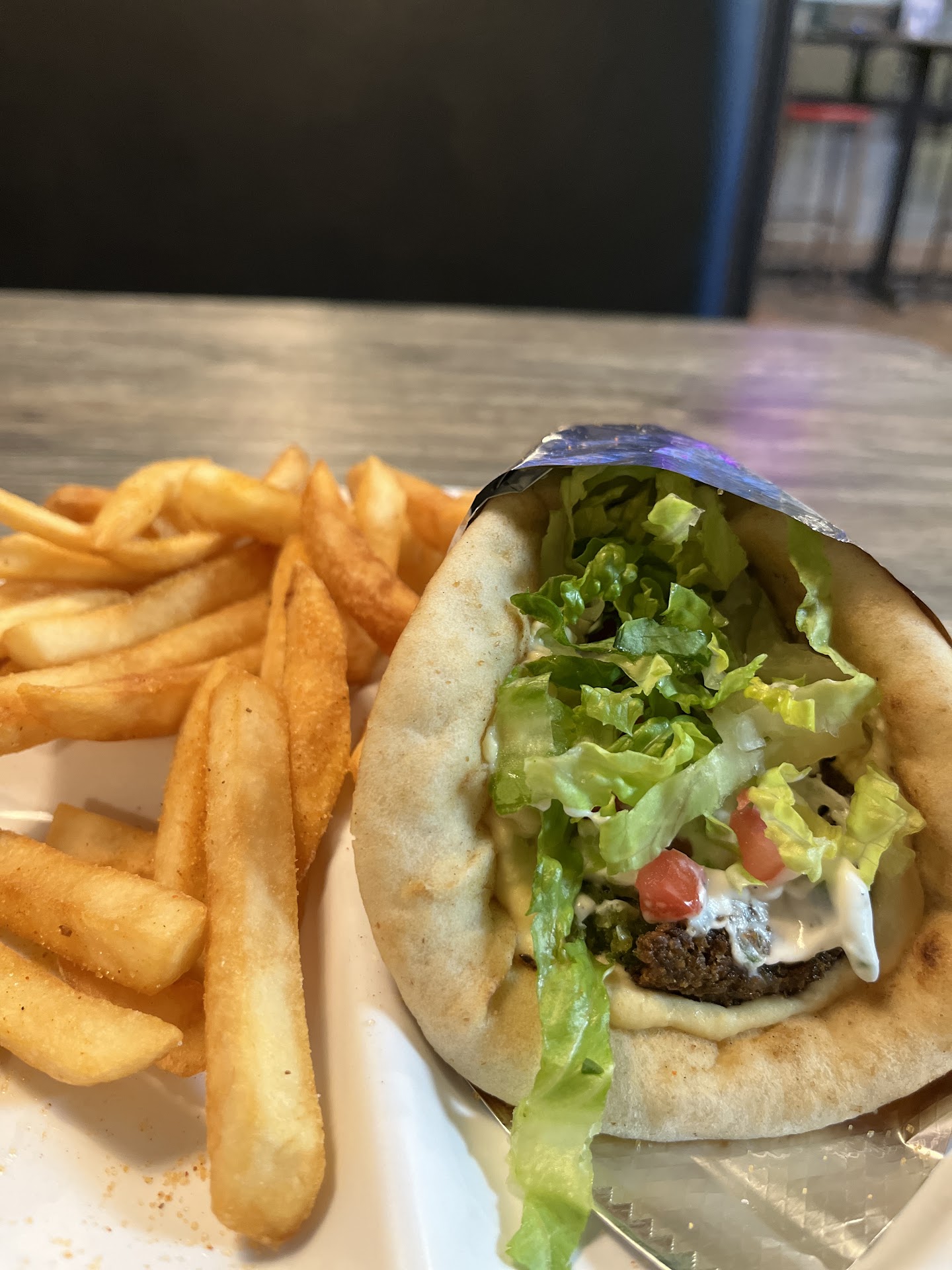 The pita bread was very good, the tzatziki was ok but I’m eager to try the garlic sauce next time, and I’ll opt for the falafel or a plate instead. The fries were very good (finally, a place that doesn’t use battered fries!) plus the seasoning salt on it was perfect, reminded me of my favorite pizza place from New England.