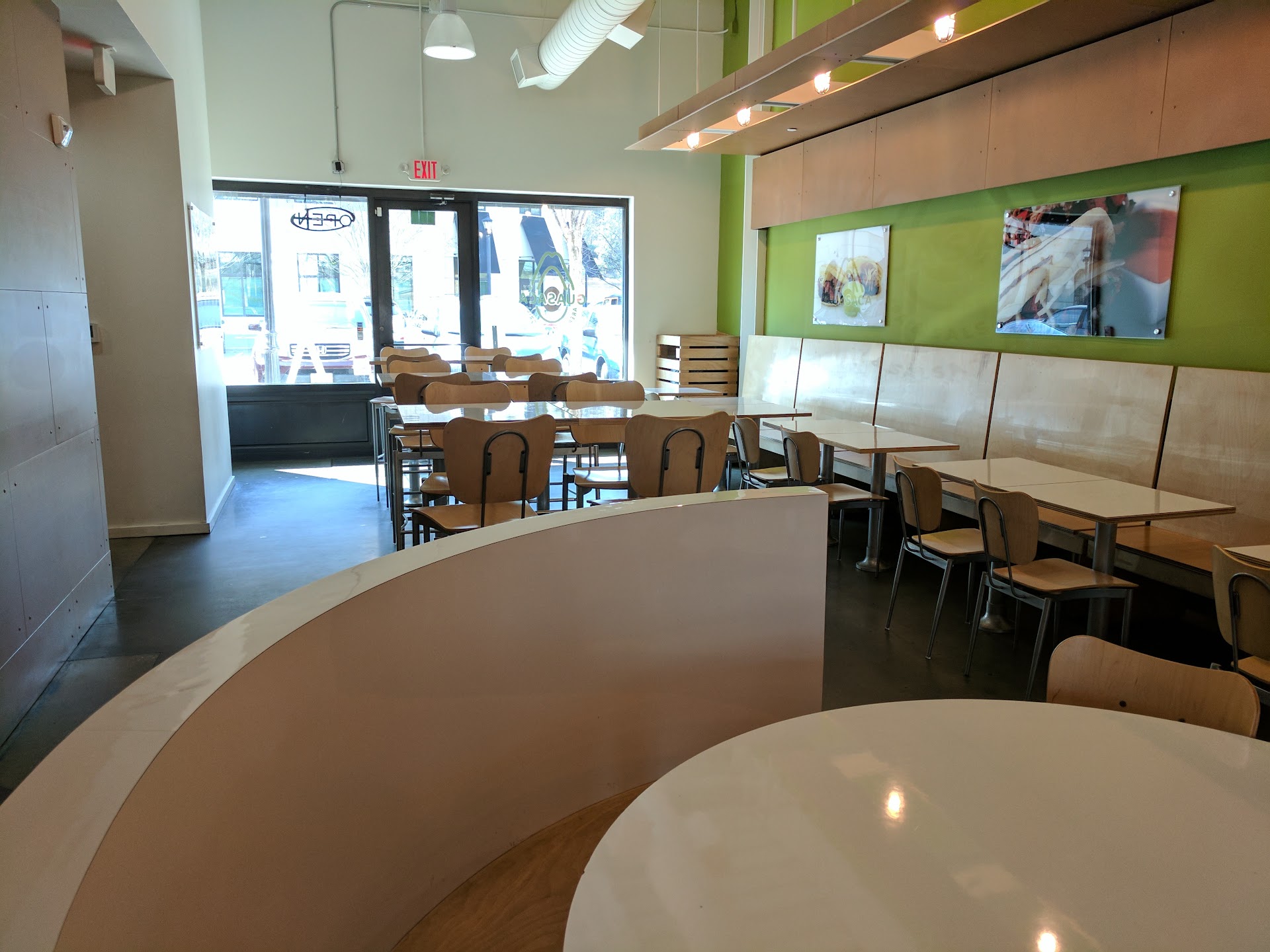 Wonderful, fresh food and interesting flavors. The only real downside is how uncomfortable the seating is (but I am guessing the owners don't mind--they are hoping to turn over the tables quickly! That place is hoppin' at lunch!) The line may seem long when you walk in, but it moves fast because the service here is quick. This is not the place to go if you feel like having a leisurely lunch chatting with friends. A couple of reasons for the less than perfect score. First, did I mention the uncomfortable chairs? They are hard wood, as are the tables. But the are designed with visual appeal in mind more than comfort. In fact, there isn't a soft surface or rounded corner to be found in this environment. Second, all those harsh surfaces make for a loud environment, too. Yeah, I get it, it is a quick place with a walk up counter, but would some simple baffles be too much to ask? Third, this place is a favorite of vegetarians, vegans and also the gluten-free crowd. (Wait, did I type that out loud?) I kid! That is actually a plus. This place is great for omnivores and eaters with restrictions, alike. But as other reviews have pointed out, be careful to ask, because some of the beans are cooked in fat!