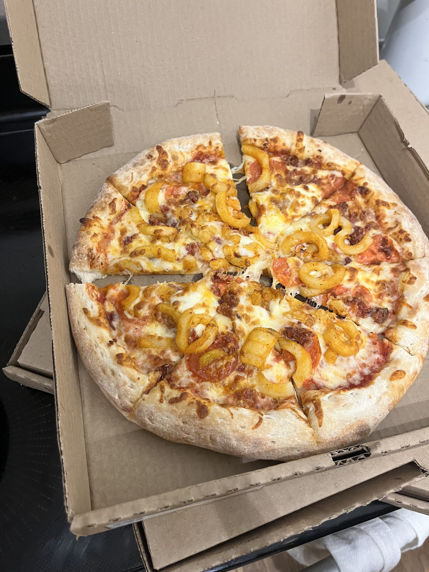 Honestly, worst customer service Iāve ever had to go through. Hereās a photo of the stoner pizza without the mozzarella sticks. It did have the fries on it so maybe thatās what he thought he put on. That didn't give him the right to be so terrible...