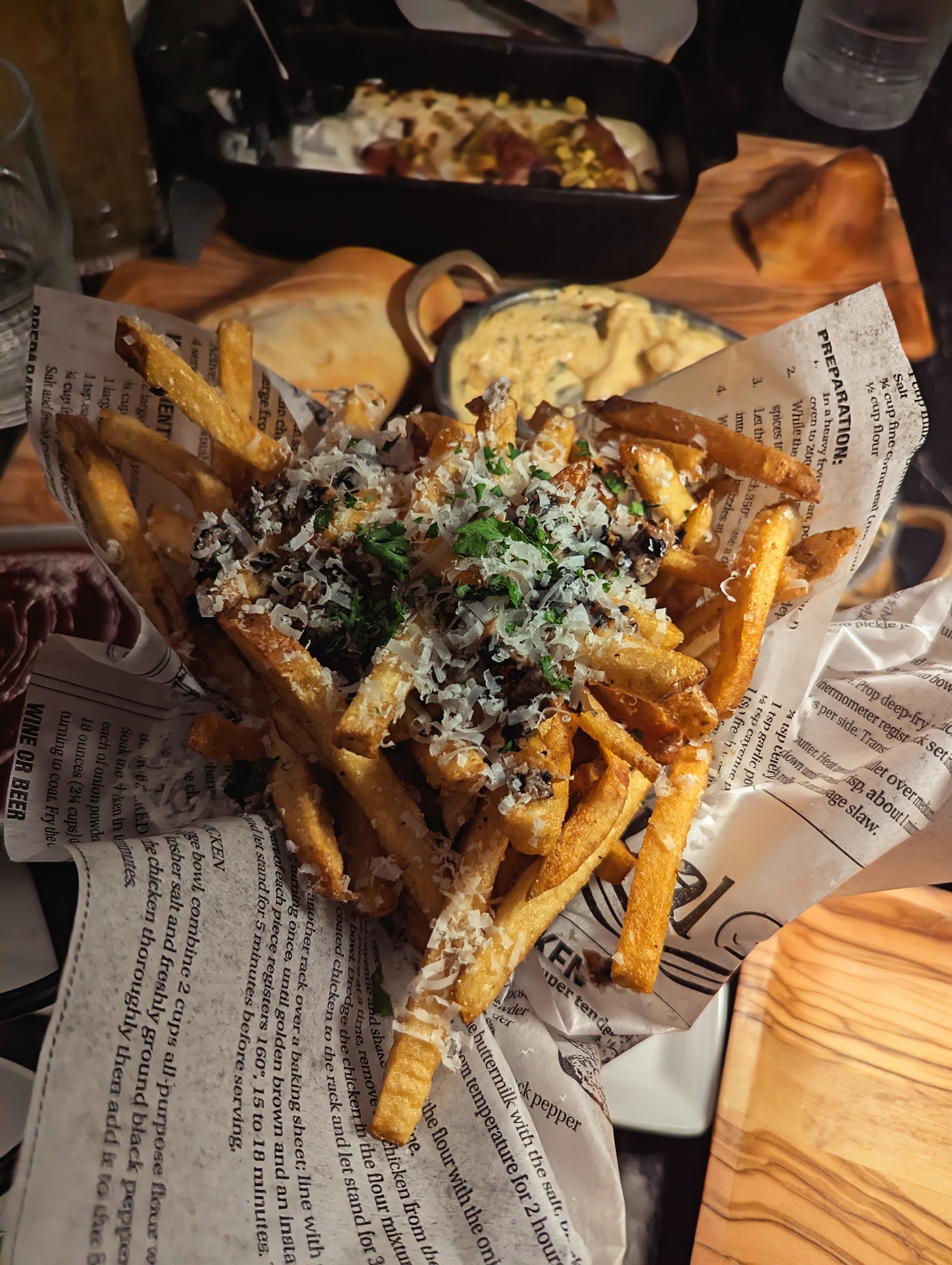 Fries with the bourbon ketchup. Seared tuna stacks Baked Ricotta NC Crab dip Chicken Ka Cobb salad wraps (my favorite)