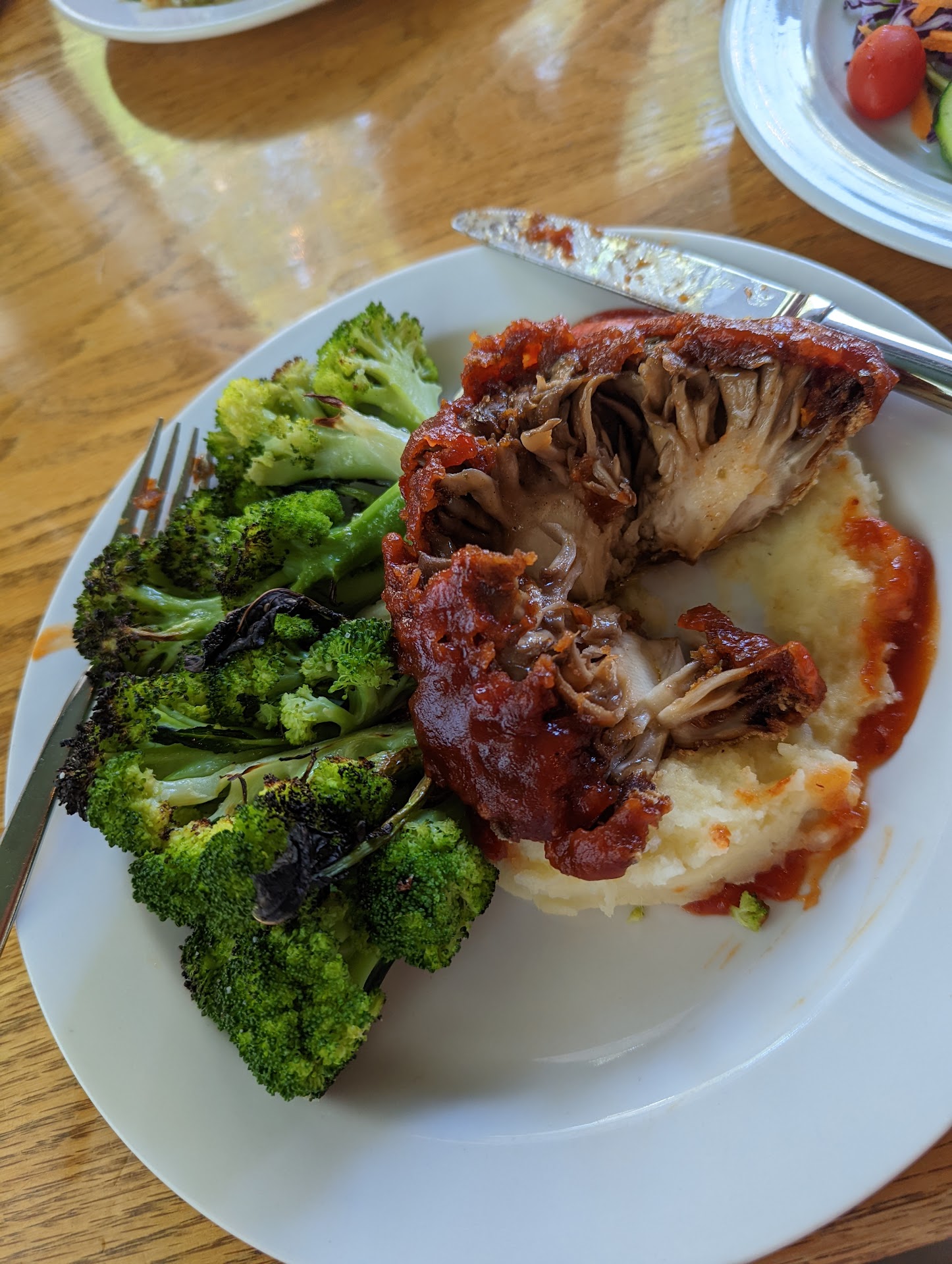 I got the most expensive vegan option of course. A "North Carolina BBQ" prepared maitake mushroom on mashed potatoes with a gorgeous, perfect amount of broccoli. Now the fiction kitchen has an Eastern BBQ plate which I love So I was very surprised when it showed up with a ketchup/tomato-based sauce. It was delicious Even though it was a western NC style barbecue sauce. Haha
