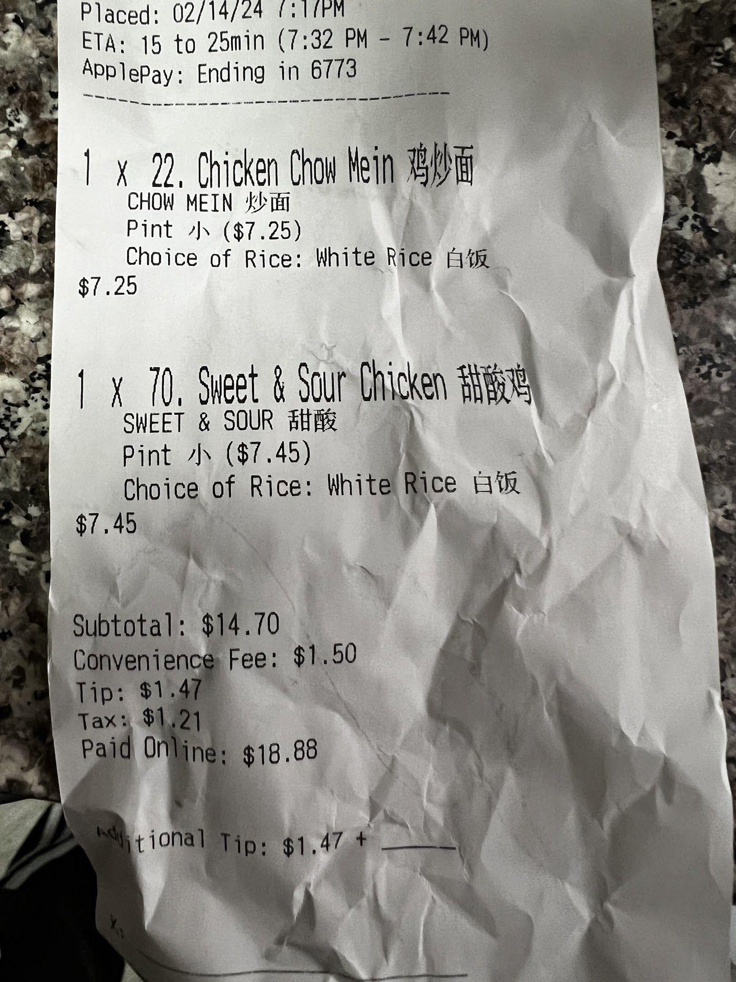 Read moreHit or miss with this place. Some items are good and some are NOT. This is the second time I ended up throwing most of the food away and I was very hungry. The CHICKEN WINGS are okay, but I’ve had way better. The shrimp fried rice had only 2 SHRIMP in it and was very crunchy and undercooked. I was so hungry I picked out all the peas, onions, and most of the carrots then threw away the other half. The VEGETABLE CHOP SOY was also very crunchy and undercooked. I fished out the BROCCOLI which was the only thing eatable. I also nippled on some of the carrots since I like raw CARROTS anyway. The CABBAGE in the EGG ROLLS were also crunchy. Very disappointed in the lack of flavor and tenderness in the entire dish. I know you may be busy but please cook your VEGETABLES longer! I’m sorry to say this but it was a waste of money. I won’t be coming back...