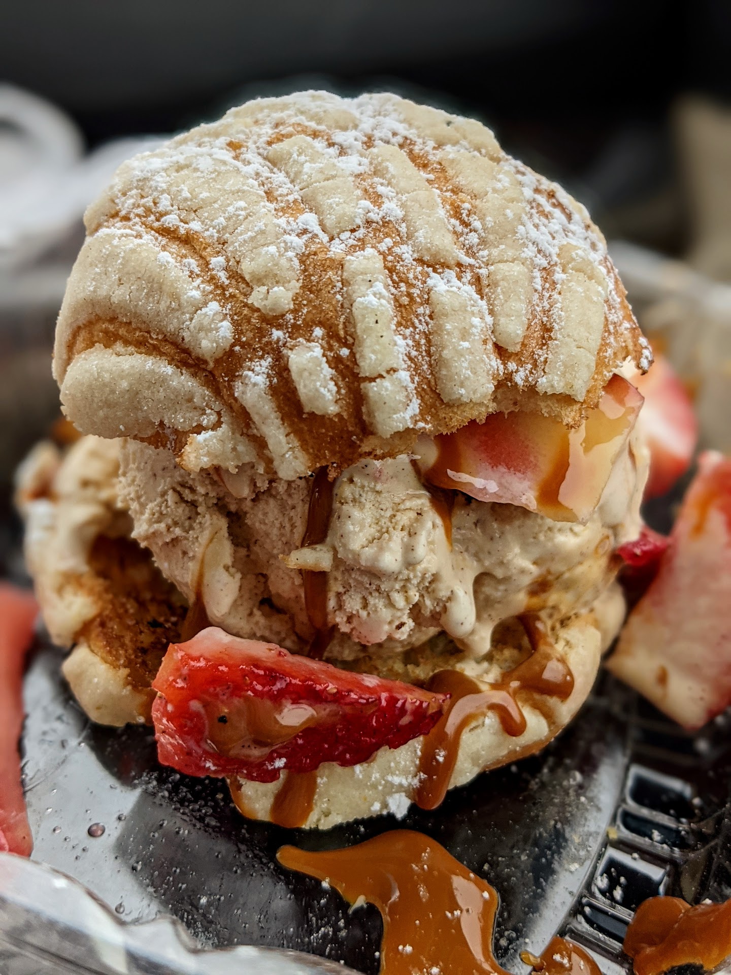 We got a mazapan Horchata (a peanut based Mexican dessert) and a mini concha ice cream sandwich with Horchata ice cream and a dulce de leche drizzle.