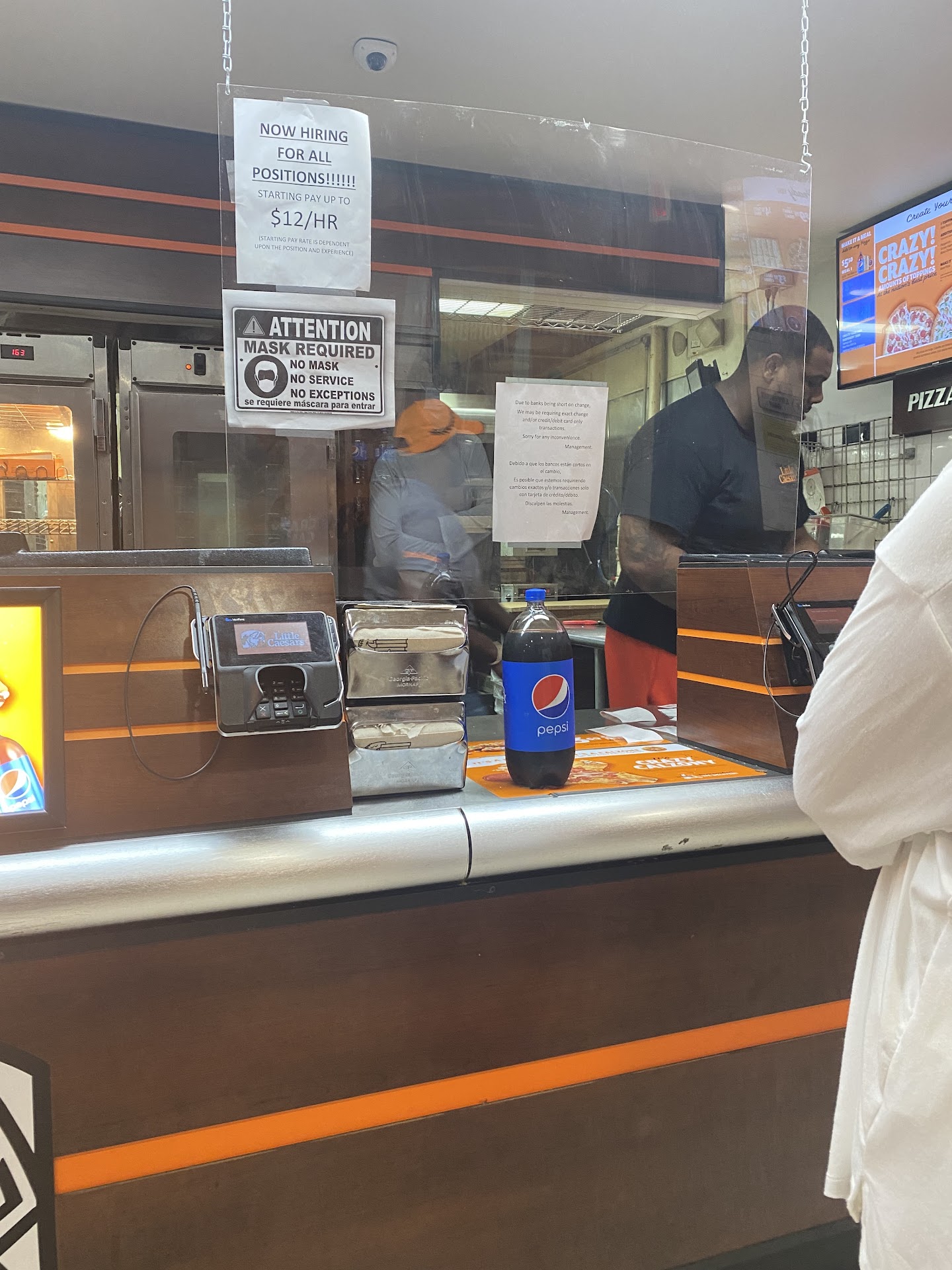 (Plaintiff stated due to COVID-19, the pizza slices were trashed since they had already been touched and pizza was brought back in with remainder due to the fact).