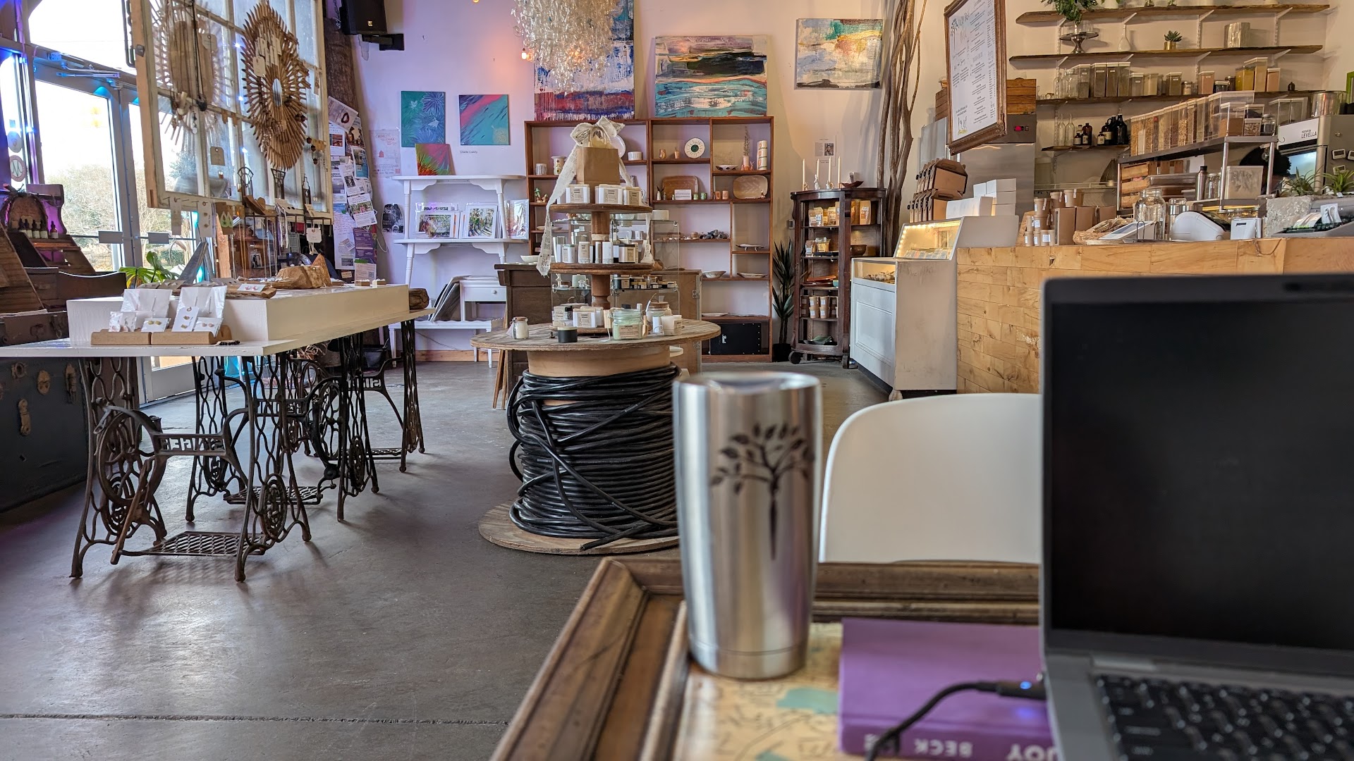 I was on my laptop here today and realized I should mention that while Lucky Tree is a fine place for quiet decompressing before work... reading or journaling, it's also a great place for group meetings (large tables) or co-working. It's very laptop friendly - there are power outlets everywhere. (A lot of places feel like they are getting away from this). Maybe buy some crafts or artwork while you're there...