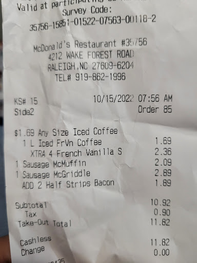 Read moreHad a a really bad experience today was my first time at this location which I regret even going. I ordered through the mobile app and was expecting my order to be very simple. I had my burgers plain and I wanted to try the 3 piece crispy strips and an iced coffee extra cream and extras sugar which specifically it said 3 extra cream 2 extra pumps of syrup. The coffee wa every dark and tasted burnt I asked the lady at the window for extra cream and she gives me one. I asked her for 4 more. The coffee was still with the burnt taste. I threw it out!! My food rates really old and the chicken strips you can tell weâre sitting in the heat tray way longer than it was supposed to the timers are suppose to be used for a reason since they are suppose to be following food expiration guidelines and probly ignore the timers set on the food. Overall experience has been the worse ones Iâve had in Raleigh. I called the location and get out me on hold. I will not be returning and definitely do not recommend if youâre in the area just go to Arbyâs across the street or your better off going to the following McDonaldâs...