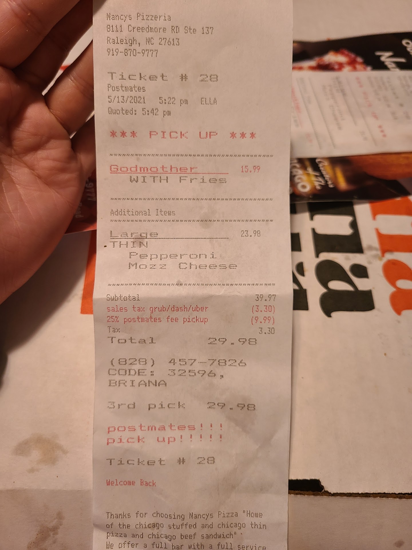 Prices..... now, this (and the fact that it was way too late), is where all these stars are knocked off. I understand that postmates has some fees, and I order through them all the time for various restaurants, and have NEVER experienced this.. these prices are RAISED in postmates. They are more expensive menu prices then the actual menu... then at the end, it still charges the postmates fees. Not sure why the restaurant changed their prices in the app, but that is total gouging! I got the receipt from the postmates driver, and my meal should have been $29.98, supposedly, before the postmates fee/delivery/tip... I noticed on the app, they charged my card for well over this amount, and when I looked, the actual ITEMS were more expensive on the app then their actual POS in the restaurant. So let me ask... WHY AM I PAYING $57 (BEFORE TIP), WHEN THE FOOD WAS $29.98?!?!? It doesn't make sense. I added photos to show times and prices, and also how the chewy crust looks.. such a disappointment. This place is NOT worth it. WAY too expensive, and may be waiting over an over to eat your food. The pizza isn't that great, either. I've had way better pizza in the Raleigh area, for...