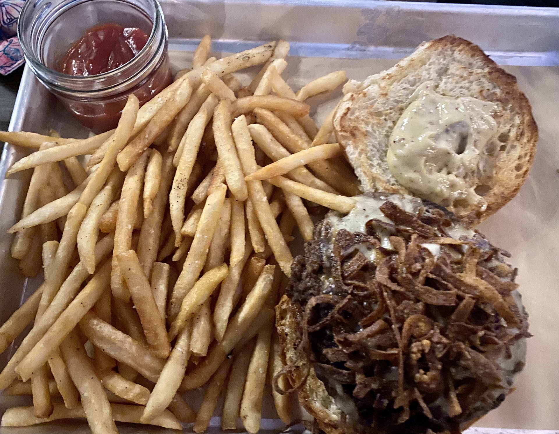I am a picky eater but thatâs not why I have a difficult time choosing what to eat here. The duck melts in your mouth but I was in a burger mood tonight. This burger has so many flavors that blend together perfectly: roasted garlic aioli (they should bottle this, itâs that good), beer cheese, house-made pickles (you canât get a pickle this good from any store), and crispy onions all piled on a Union Special brioche run. My husband enjoyed his beer flight and the cocktails were delicious.