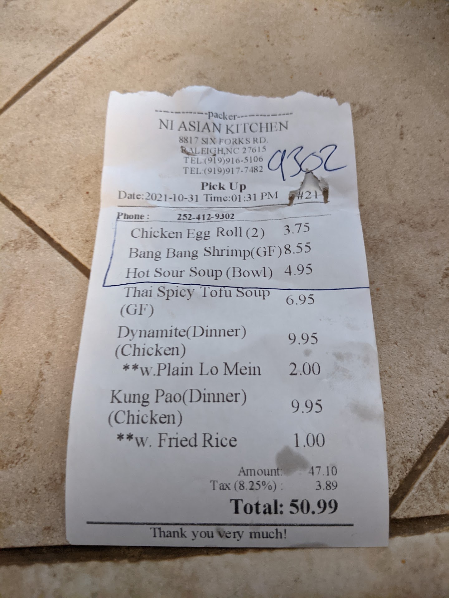 Read moreOrdered dynamite chicken, kung pow chicken, two egg rolls, hot and sour soup, spicy thai soup and bang bang shrimp. Chicken was cooked good. Flavor was severely disappointing on both dishes after reading reviews and the description. We got it how it came, no extra spice and not only was it not spicy at all but had no flavor really. I ordered lol mein instead of rice, was two dollars extra over the phone. Looked at the online ordering after the fact and it was only a dollar to add it there. What the heck? For 95 cents more I could have gotten a side of low mein in addition to the rice it came with. If the entrees hadn't been so disappointing I'd probably do that next time. Egg rolls were ok, nothing special or bad there. Bang shrimp were good but pre sauced so getting it to go was soggy. Good flavor but ruined by the pre saucing. Most places put it on the side. Lastly and most importantly, the soups were terrible. I can't really say enough bad things about it. Bland, not spicy at all. Seriously, do not get the soups. I've had dozens from different places and these were some of the worst. I would get the chicken again, hence the three stars. The different charging online vs on the phone, terrible soups and lack of flavor knocked two off. I thought that was very fair. Adding photos of the online order amount and what ours was from calling in. I know it's just a dollar but still...
