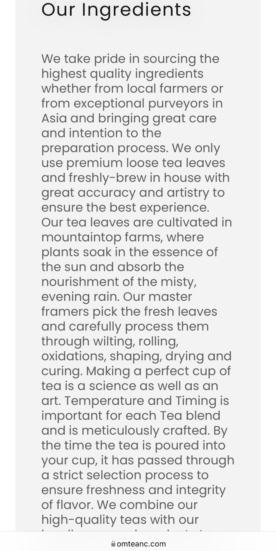 Edit: it seems like the picture didn’t get uploaded, on their website as of the time of the review, it says: “ We take pride in sourcing the highest quality ingredients whether from local farmers or from exceptional purveyors in Asia and bringing great care and intention to the preparation process….. Our tea leaves are cultivated in mountaintop farms, where plants soak in the essence of the sun and absorb the nourishment of the misty,...