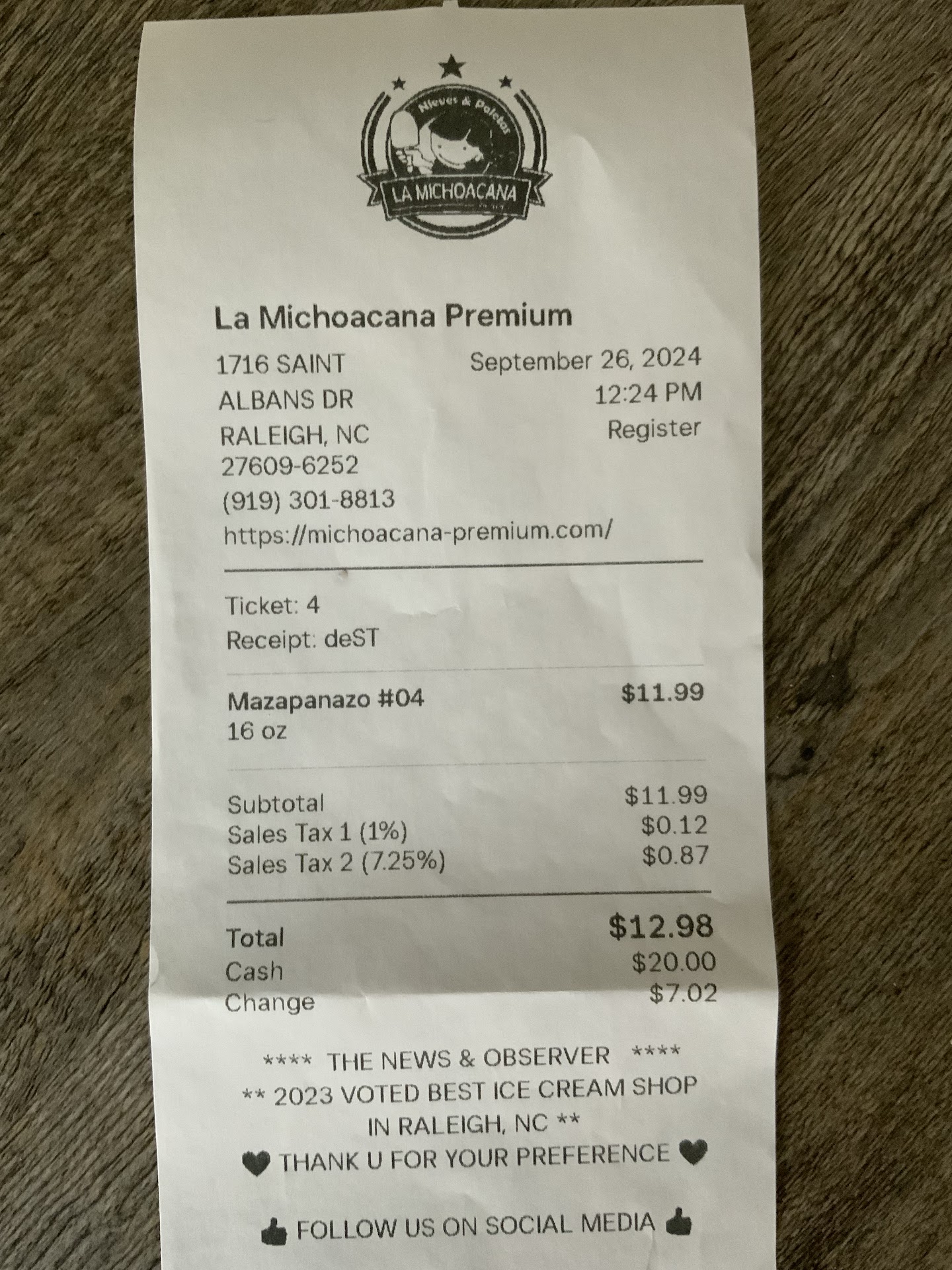 Read moreLa Michoacana is a unique Mexican ice cream shoppe in the Midtown area of North Raleigh. It's tucked away on St Albans inside of an unassuming strip mall that features Latin eateries and bakeries. You can't miss the yard with all of the unique animals, Mexican flags, and ice cream decor. I was craving a refreshing ice cream after perusing the State Farmers Market. I wanted Latin style shaved ice. Upon arrival I took my time to peruse the menu and was greeted. I decided on the #24 Raspanieve. Raspanieve is a Mexican dessert consisting of shaved ice, flavored syrup, and sometimes fresh fruit and ice cream.Its very rich and dense and refreshingly cold for a hot day. The young lady at the counter was very beautiful and offered excellent customer service. She smiled and was kind enough to share with me all of the flavors. You must choose 1 flavor for the shaved ice and 1 flavor for the ice cream. I spent some time in the adorable yard that features a cute playground, and lots of outdoor seating. Once prepared I received a humongous cup of shaved ice topped with coconut ice cream. My family is from Jamaica, so coconut ice cream is a favorite of mine. This ice cream was some of the best I've had in a while. Huge coconut shavings ! The mango flavored shaved ice was so crunchy and cold ! This combination with the condensed milk is paradise in a cup. You can share this because it's so much for the value ! For the Quality and large portions you receive here, the price is just right ! I ordered a small which is actually a large for $9.73. It's not cheap but nothing worth having is in...