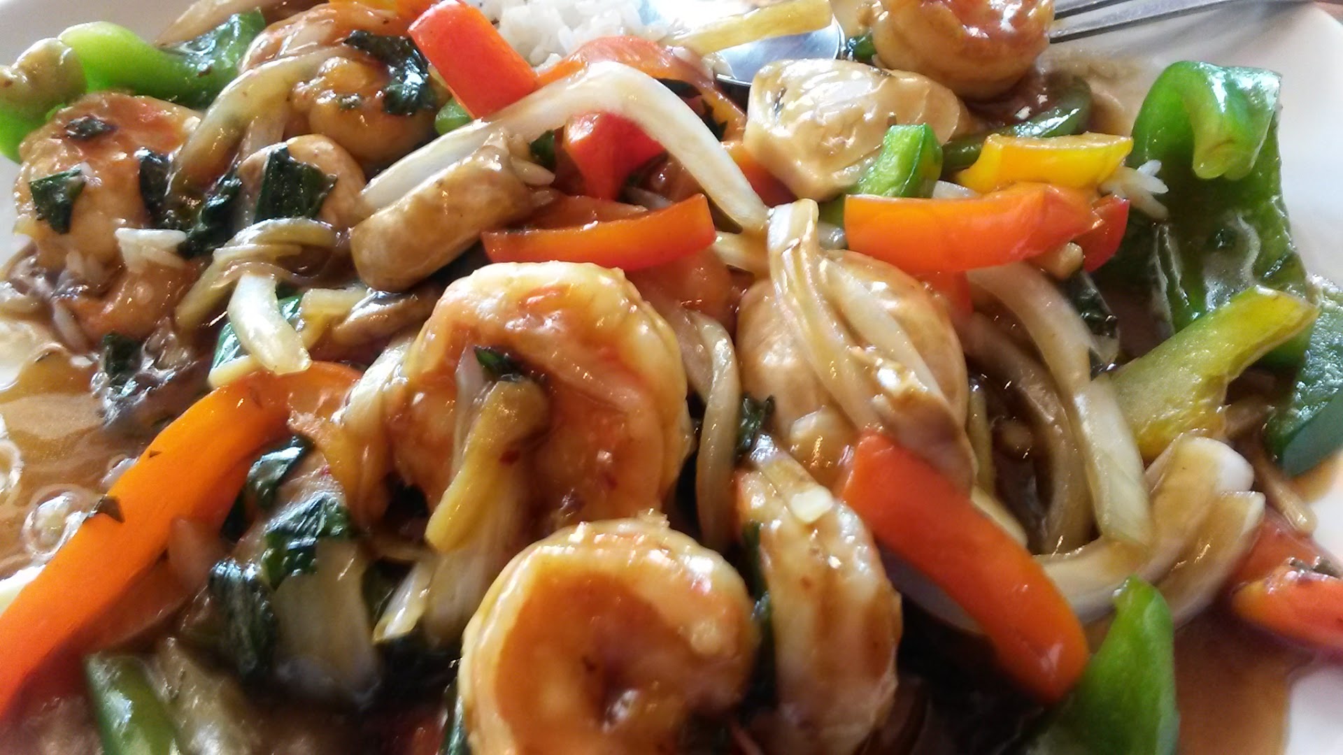 It was DELICIOUS, too. I had the Thai basil shrimp, requesting it barely spicy. (Pictured.) Shrimp and all veggies were juicy and perfectly cooked. My guy had the house fried rice, which had a very rich, deep, delectable flavor for it to be "simply" rice.