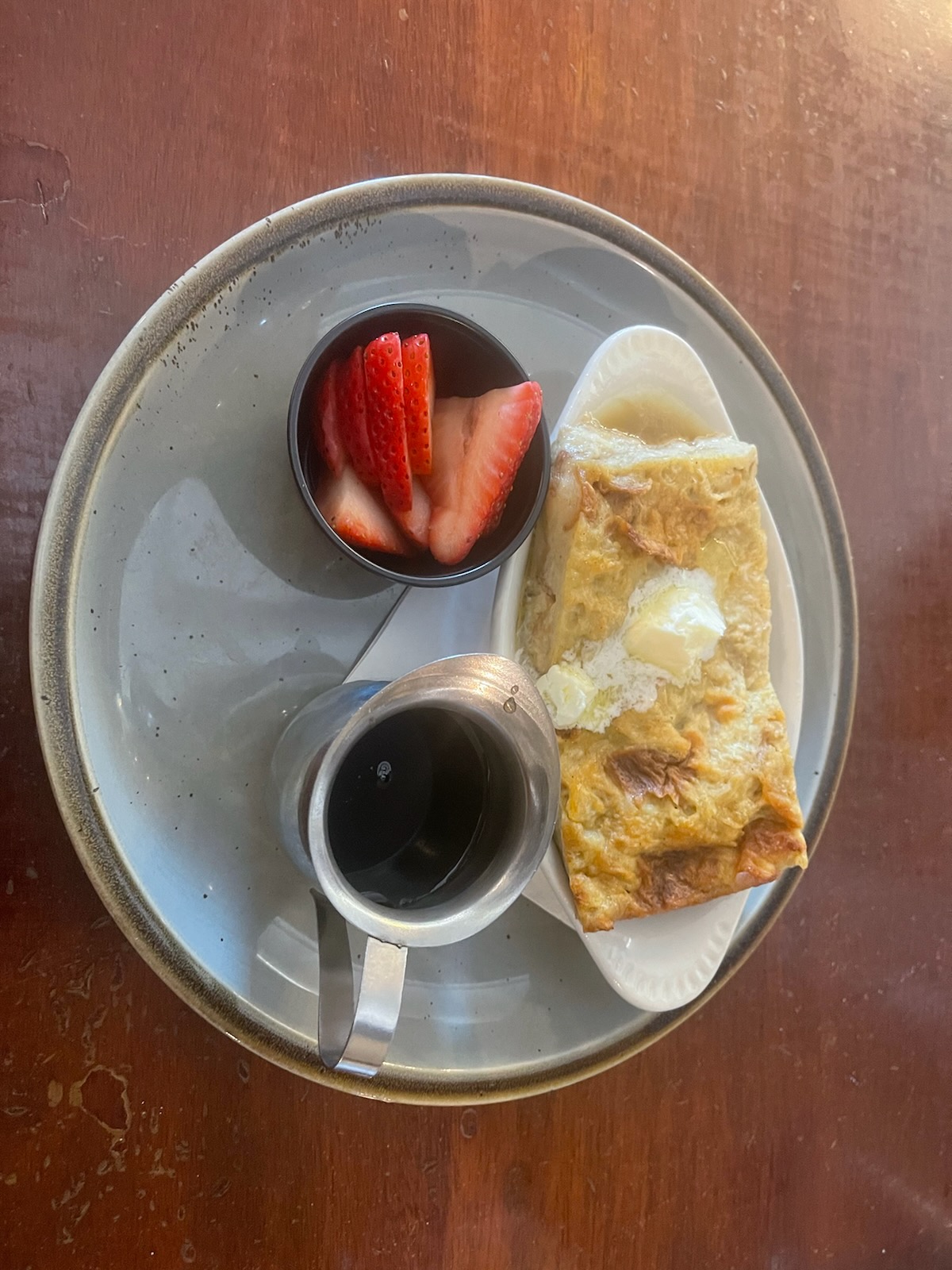 French Toast Bread Pudding: Again So disappointed! Beautiful dish but flavor was none! Could not taste cinnamon or nutmeg. Generally, french toast bread pudding has a lil crispness to outside but soft on inside. Unfortunately, the bottom of this dish was mushy. Most likely the portion became soggy from being served on top of their version of maple syrup. Therefore, if there was any caramelizing during the baking process, its now gone. Plus, the syrup at the bottom of dish appeared to be room temperature. we ate half of the portion.