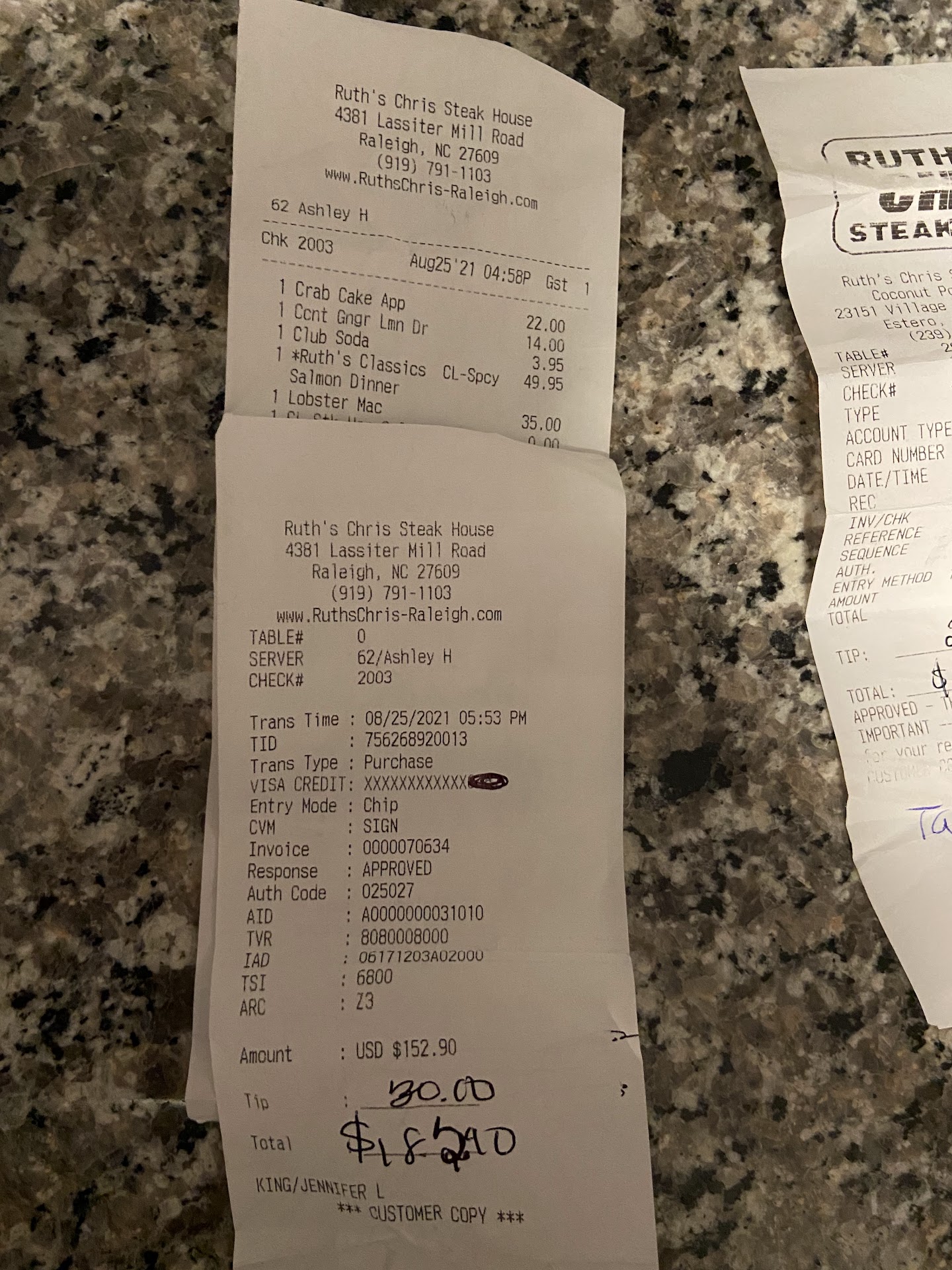 Read moreThis was my first time visiting Ruthâs Chris in the area. I normally go to the Greensboro location because itâs closer, but since my family and I were in the area celebrating my parents anniversary we chose this location. I must say I was very disappointed in the quality of food. In comparison to my previous experiences at the Greensboro location I held all Ruthâs Chris restaurants to a very high standard. However, Iâm ashamed that I even recommended this location for my parents anniversary, which was their first visit to Ruthâs Chris. The mash potatoes that two family members and I received were disgusting, there was a lack of seasoning, and required us to use a generous amount of salt. They had a raw taste to me as if the potatoes could have been cooked longer before being mashed and served. My sisterâs mash potatoes actually came in a dirty dish that had to be sent back. It looked as if chocolate (something brown if not chocolate) from a dessert had not been fully cleaned out of the dish. My husbandâs spinach was not creamy, they were very watery to be exact. He loved his steak, however the chicken that my sister and I received could have been better seasoned. Iâve previously had the exact dish at Ruthâs Chris in Greensboro and the food was phenomenal, no extra seasoning needed or complaints. Iâve also had the spinach before and that as well was exceptional. Iâm not sure if this is an ongoing issue at this location, but we didnât complain, we finished what we could, paid for our food and services and we simply will not return or recommend this location. The server was attentive initially, but that quickly became slacked. Overall, this was a horrible experience for my familyâs first visit. I vouched for this restaurant and now I have to convince them to give Ruthâs Chris another chance at the Greensboro location. I have no desire to return and management really needs to tighten up on everything. For the prices you expect nothing but a great experience and food, and unfortunately my family and I didnât...
