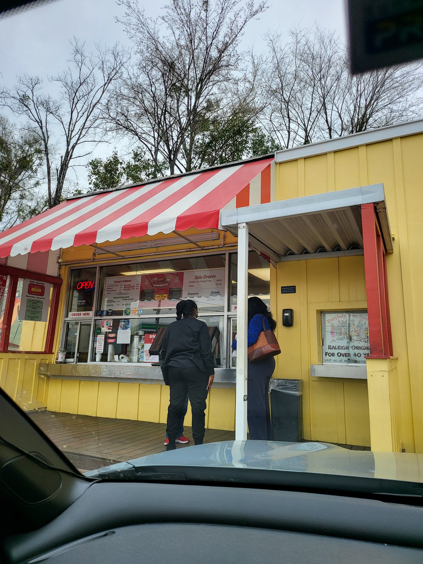 Ok so here is what is behind the yellow building inside scoop from a former employee their hot dogs are boiled not grilled chicken salad for sandwiches is frozen then prepared for those day before BBQ is flash frozen coming from a box in a cooler burgers are the only thing good here if you want a boiled high priced hot dog come here on hot dog special days only to avoid the high priced low quality hot dogs here get better hot dogs else where in Raleigh NC unless you don't care then 😎 everything here is not worth it unless you just want something quick drunk or don't care what the high priced products are here then it might be worth it sane people not insane sheeple with money will try a roll of the 🎲 elsewhere for a better investment I should know I was a grill cook until I left cause they were violating NC heath safery regulations here at this location I feel sorry for the customers they will feel it making a run and having the runs camping out in the bathroom good luck with that it's a 99% buissness risk and a 1% you' might be ok it is what it is food is so bad I brought MC'DS to eat on my break at the hot dog prison here working as a employee it's that bad food is overpriced preschool cafeteria food low quality but high priced to make it seem it's good it is not as long as the sheep customers are fooled they will stay in buissness it's the snoppy way!! To have dumb customers 🤡 pay for high priced bad prices and food every day o happy mangment...