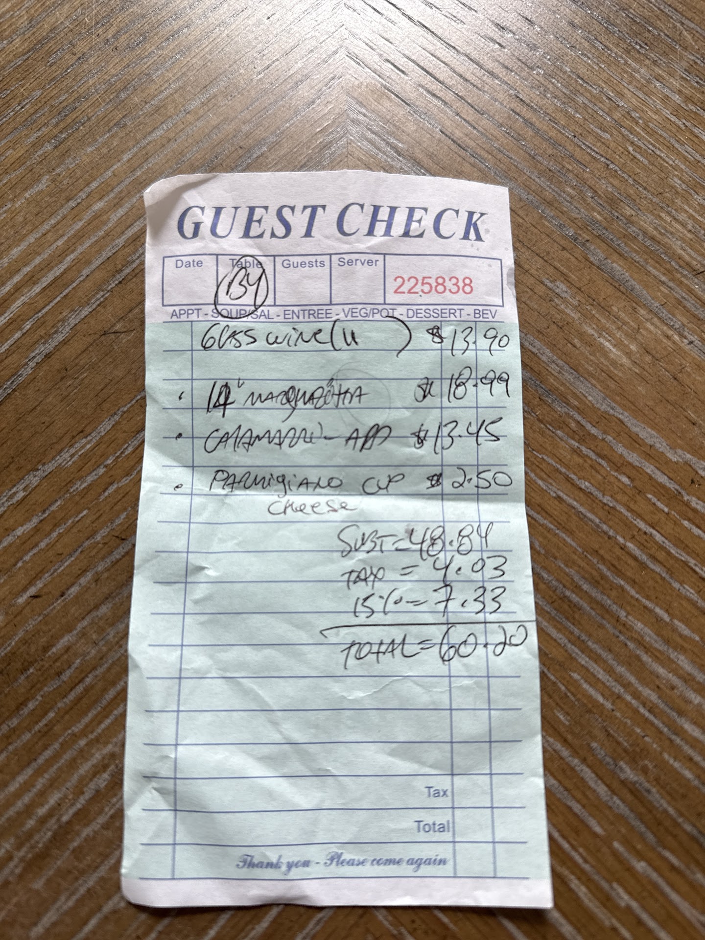 Read moreWell where do I start, My husband , granddaughter and I decided to try a different Italian restaurant for the one we normally go to was closed. Upon entering, we were seated and waited over 15 minutes just to get our drinks gave our order and our appetizer which was calamari took over 45 minutes to come out I could not eat it. It tasted like rubber I could not even chew it. . ( both appetizer and order was put in at the same time.) our food came out an hour and 15 minutes later to my disappointment!! I ordered eggplant rolatini, was not rolled, flat and dried out very disappointing. Nothing like I’ve ever had before and I cook Italian.!! No bread , no salad with meal! Other meals were nothing to talk about. But being that we waited so long, just sucked it up and I ate the pasta, and did not complain.!! And the best was a bill was $77.76 they added a 20% tip which the lighting in the place is dull could not read the total so our 12 year old granddaughter told us the total to be 92.13. We always tip 20 to 30 percent so we paid their gratuity, plus not knowing our tip. I’ve never been in a restaurant where it wasn’t a party of six or more that gratuity was added and it should’ve been disclosed to the customers. I worked in the industry and would always let the customer know if gratuity was added just common courtesy!! When my husband got home and read the bill, notice the gratuity and called the restaurant tried to explain what had happened the guy hung up called back no one would answer!! if you want good Italian food go to Christinas excellent food salad bread included, and the service is always...