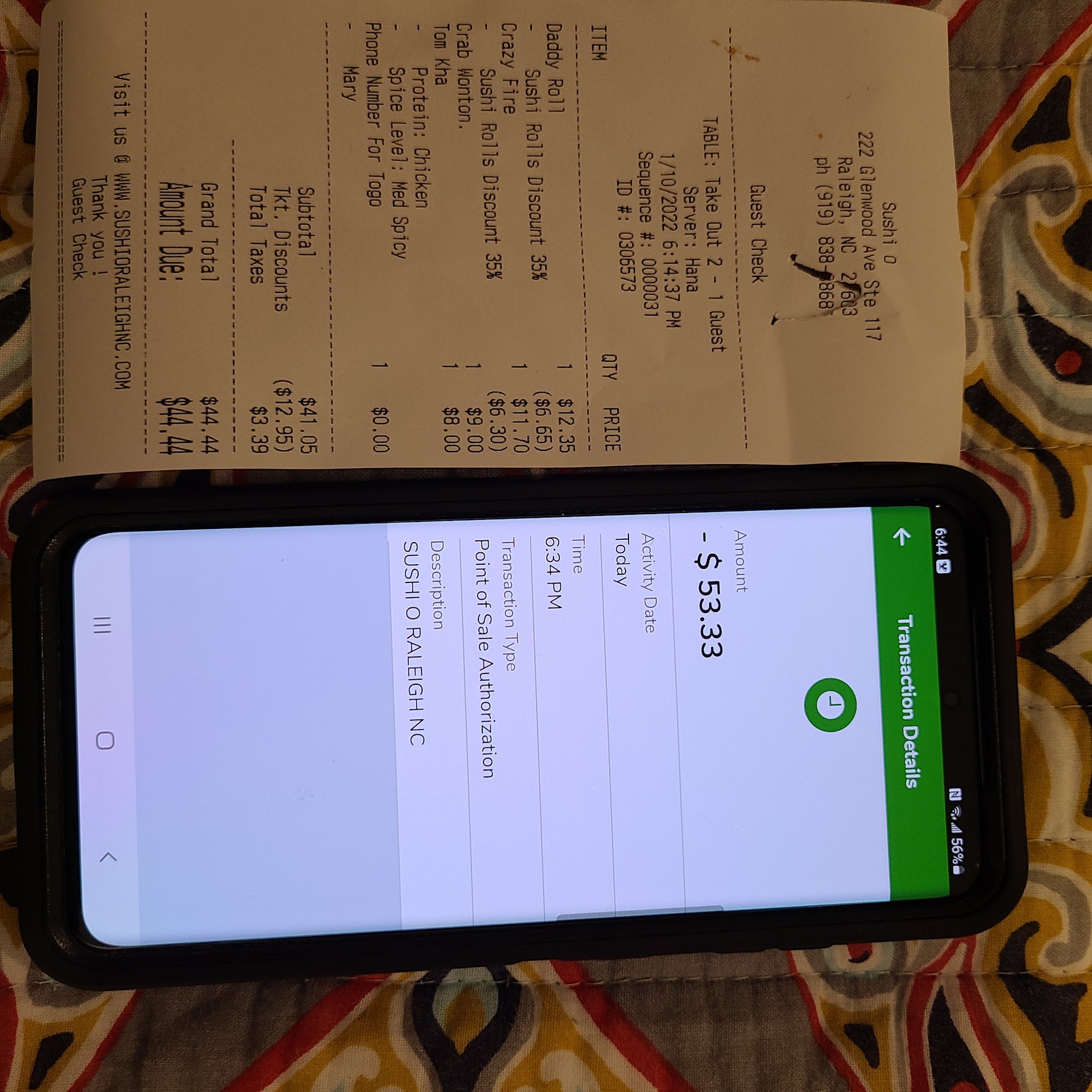 The saving grace of this evening was the food quality. The cooks did an excellent job with our egg drop soup orders, crab wontons (Rangoon), and sushi rolls. All was amazing.