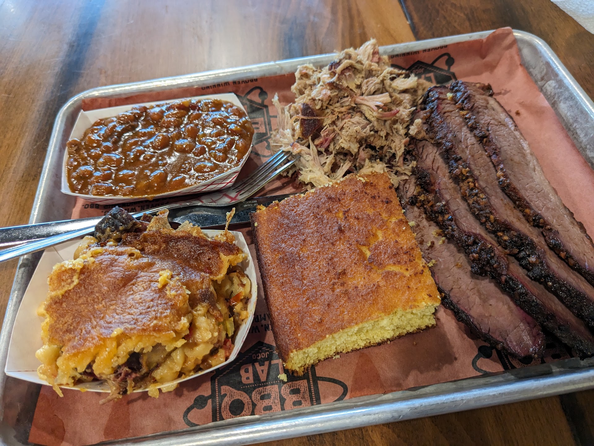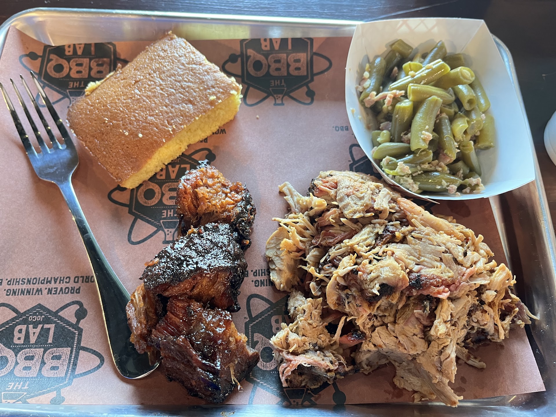 Read moreFirst time ever trying Texas BBQ and OH MY GOD words cannot describe how good this was!! The brisket was flavorful and SO tender!! I know I'll get my NC card revoked lol But, it was better than North Carolina BBQ. Before coming here, I was going to go to another Texas BBQ place but they were closed for the holidays. Their brisket looked undone so I was kinda unsure whether to go in the first place so I searched other places that sold Texas BBQ and came across The BBQ Lab. I will never go anywhere else for brisket except The BBQ LAB! This food is so flavorful and so good it will touch your soul lol I'm not even joking tho...it's THAT DAMN GOOD!! I also got the St Louis Ribs. Very good and tender as well. Green beans with country ham. The flavor was delicious!! Baked Beans were phenomenal 😋 Cornbread was your typical southern cornbread, so you know it's already awesome! I got the smokey sauce to dip my brisket in but didn't really need it because that's how good it is on its own. Jalapeño Mac and Cheese was really good too and this is coming from a girl who doesn't really care for jalapeño flavored stuff. The staff were super sweet and friendly! If anyone gave this restaurant under 5 stars, they were either lying or mad at the world that day because this food is PERFECTION!! ☺️🩵 I think they got God back there cooking the food!! 😋😍 Anyways, came here b/c Chad Butler was my favorite southern artist (he was from Port Arthur, Texas-RIP) and I wanted to try Texas BBQ in memory of him! THIS PLACE DID NOT DISAPPOINT!! Highly recommend!! The BBQ Lab IS...