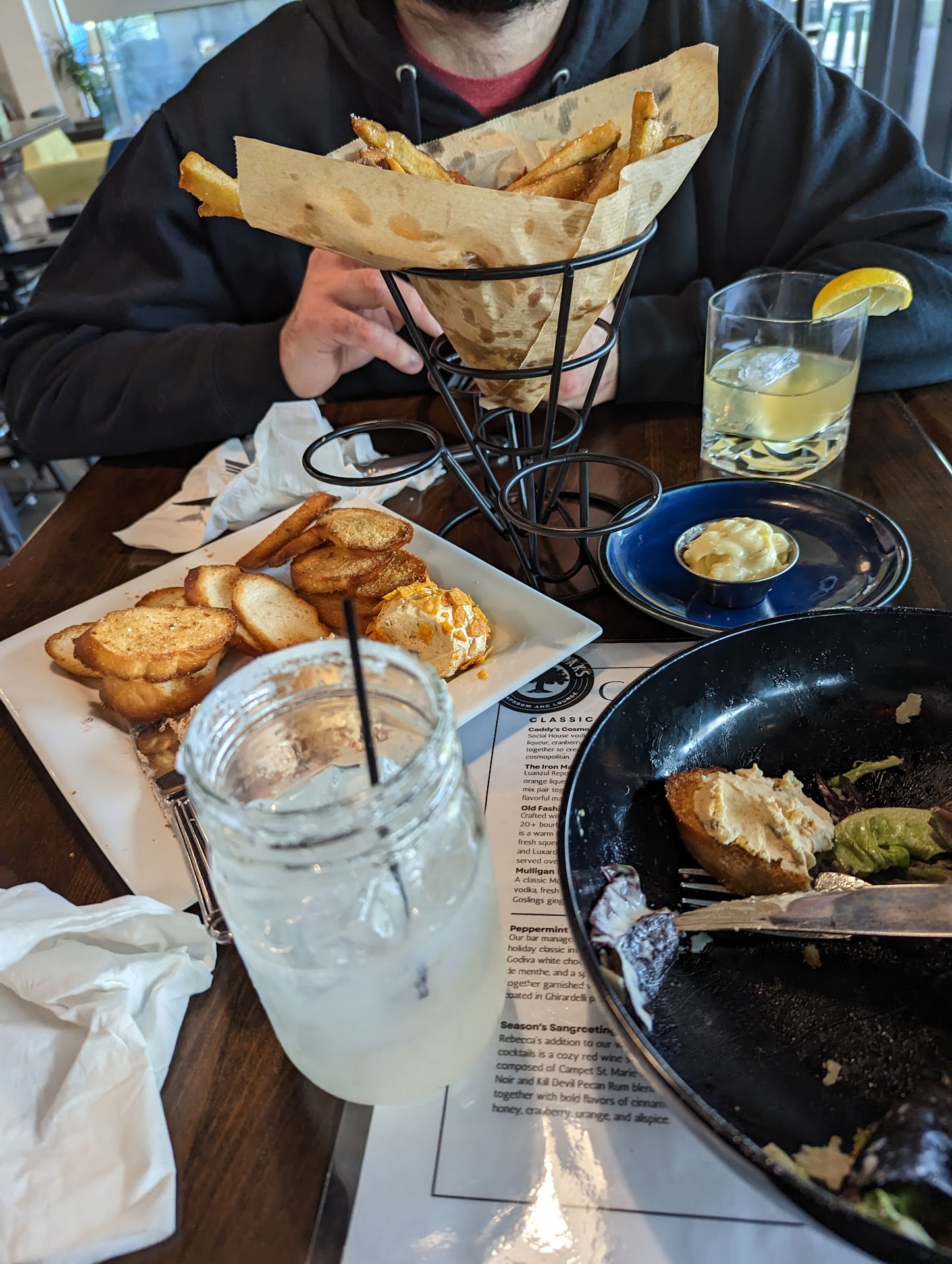 Truffle fries were undersalted and the stand they used to hold the fries was too big to fit the container used for the garlic aioli. They were out of romaine for a Caesar salad and asked if they could sub mixed greens instead, which I agreed to but was kinda gross in application. Dressing and croutons were nothing special. We also got the cheese ball trio, which comes with no actual explanation of what the cheese balls are, either from the menu or from our server. One appeared to be pimento cheese with bacon, one was a blueberry goat cheese with pretzel on top, and the last was some sort of dorito crusted spicy cheese ball, which I would not have eaten if I'd known what it was.