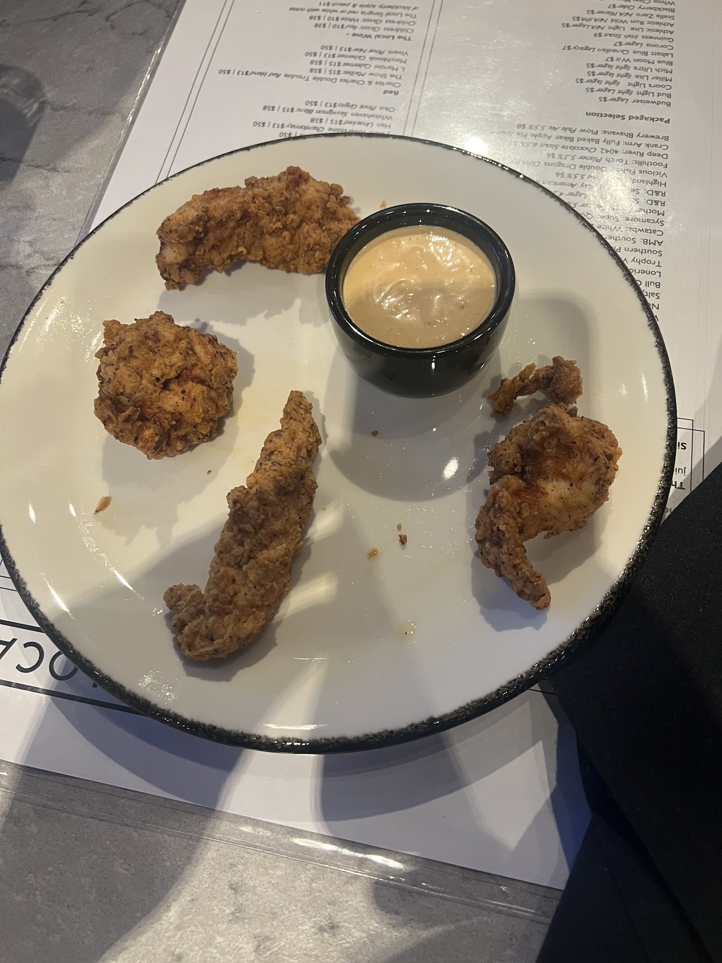 Read moreA group of 6 of us decided to stop in on a Sunday to watch football a few hours before the Hurricanes v. Caps game. We were told there would be a longer wait than it actually was (pro), but that’s where the positivity of our experience ended. I’m not sure our server could have visibly hated her job anymore than she did that day. She would make eye contact with one of us from across the restaurant & then walk in the opposite direction. Our bill would have been even higher if she would have tended to us, rather than leaving us dry. I ordered the chicken tender appetizer and the picture is what was delivered. Albeit, a very good laugh for all of us at the table, but my stomach wasn’t too happy. The food runner that dropped the app at the table turn around & walk away so fast it was basically a sprint— I think he might have been embarrassed about it too? I was going to ask our server about it, but after 15 minutes of waiting for her to return to our table, I decided just to eat it & move on. I’ll give credit where credits due: they were good. But not worth $13. Maybe I could suggest a smaller plate so the lack of contents isn’t so noticeable?