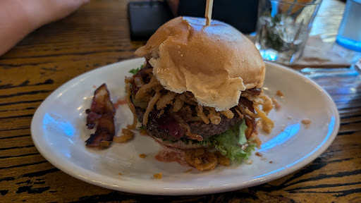Atmosphere and Service: 7.2/10 – The restaurant has a clean and inviting setup, with spacious indoor seating and respectable outdoor seating. The décor includes interesting signs, big TVs, and music, adding to the overall vibe. The bathrooms were clean, and the staff was friendly and accommodating. The menu offers a wide variety of options beyond just burgers, giving plenty of choices. Free water cups were a nice touch.