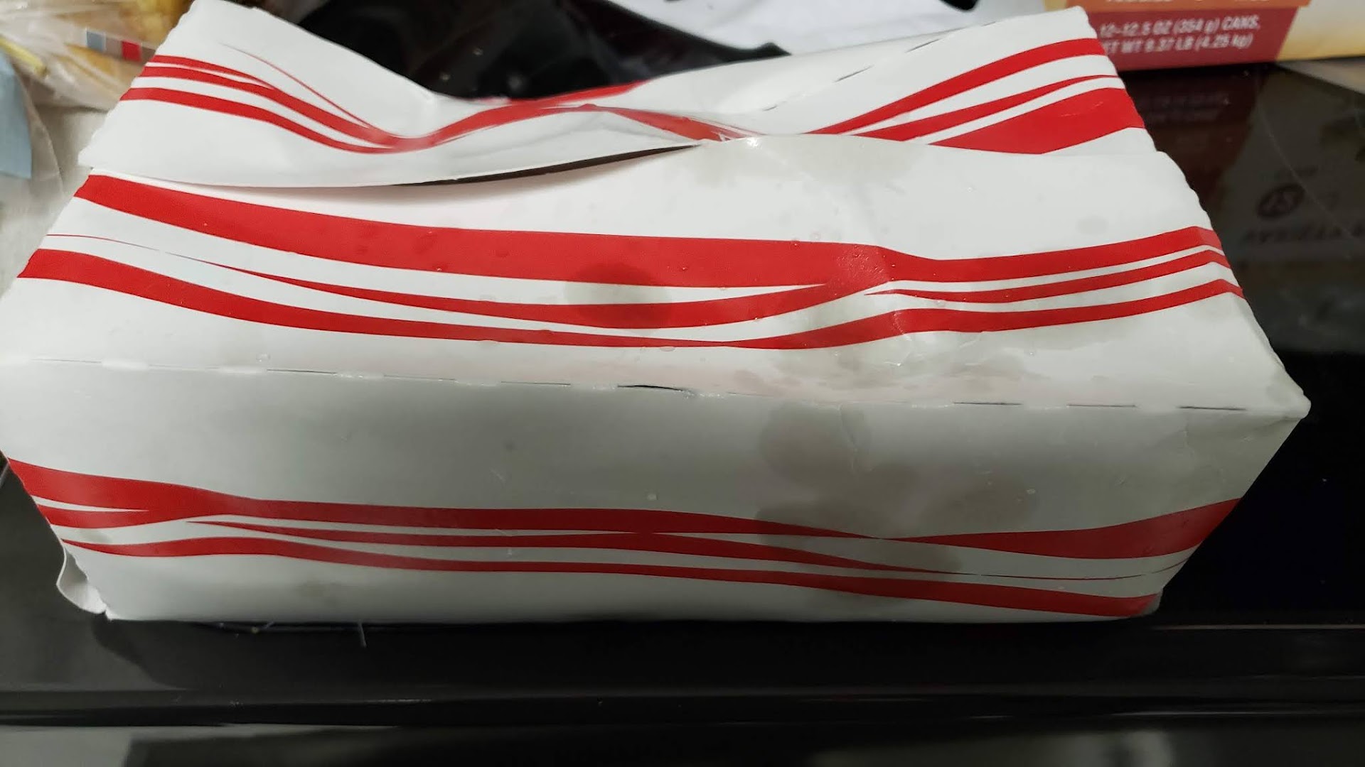 I placed our order at 8:09 p.m. for an 8:45 p.m. pickup - I only ordered the large fish and chips meal. I arrived inside at 8:43 p.m. and received my order within a minute, so that was nice. They use the same type of box Bojanges/KFC uses for takeout, or at least that's what the fish and chips was in. This type of take-out container wouldn't be an issue normally at those other restaurants, BUT Trali apparently put the hot-out-of-the-fryer food inside the box, then sealed it inside a closed plastic bag. So when we got to the car, we realized the box was essentially falling apart due to the insane amount of moisture on the box and any amount of weight on the box (like a hand) just made it start to flatten. So we had to be extra careful in traveling with the box to prevent it from completely falling apart on us. Even the outside had parts already peeling away from the moisture.
