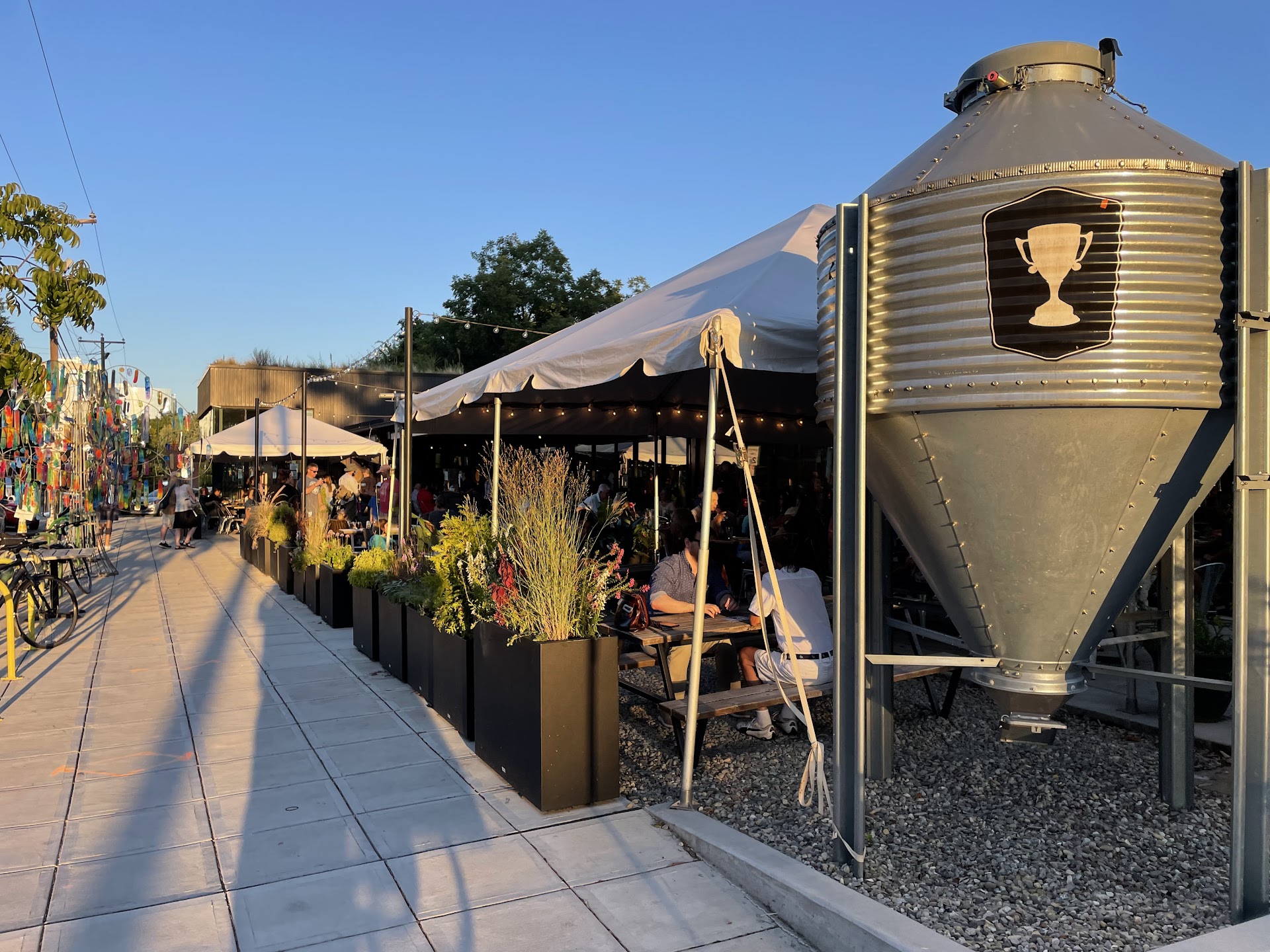 Our daughter likes the original Trophy Restaurant, first opened in 2013 on Morgan Street by Woody Lockwood, Chris Powers, and David Meeker. I like trying brewpubs with a mix of inside/outside dining areas! There’s a bar area, lots of tables, some near the big beer holding tanks , with kegs stacked up for an authentic brewpub feel!