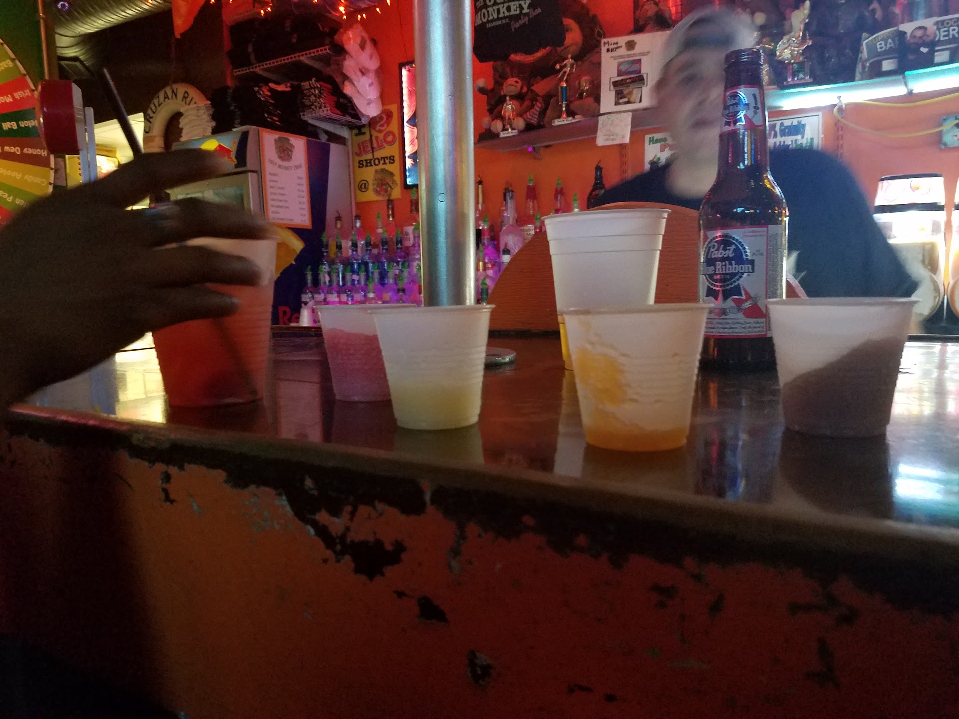 Read moreMy first Time going here All the details . (On Friday Aug. 3rd// 11pm) It was raining out but me and my Entourage found great parking, right across the street from The Ugly Monkey. We parked and walked right across the street. They have outside setting to sit and conversate It was free for ladies, dudes 5/10$. Very big and interesting place. Kinda out dated or could use a new look. But beer pong as you(front of you w/ island right beside you.) walk in. The dj Booth and dance floor is on (right). Few high stools and pool table (to the left.) Walk on back the bar to the( right) seats Stools & tablea and smoking vending machine to you (left). **Positive: They have a "random drinking wheel of Fortune" you can spend if you can't choose a drink! Great drinks. (Recommend: liquid marijuana ♥️) go further back. Another pool table (left) tv. Sitting beach (front of you) and your right there's the Laboratory (Men on the right/ Women's straight ahead). Clean facility (floors and seating included) On bathroom was out of order and one didn't have tissue. Very clean and nice place to go and turn up. Lots to do/ look at. 2 Hoola hoops to have fun with and great music. Nice security. Didn't try any food. Definitely would recommend to ANYONE looking to have a nice/good/great/awesome night out. No bad vibes. Hope...