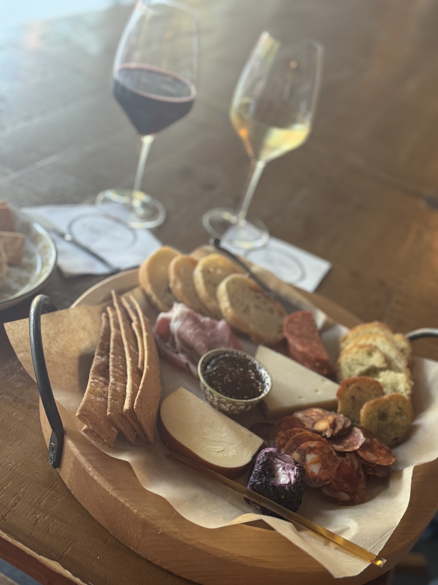 We walked up to the bar and were promptly greeted, the bartender explained several of the wines. I have very little wine knowledge but I got a sparkling red and thought it was great. We also ordered some charcuterie (we chose blueberry goat cheese, Gouda, and machete, along with prosciutto, chorizo, and pepperoni) and jalapeño pimiento cheese. My favorite was the pimiento cheese, it had a great amount of heat to it.