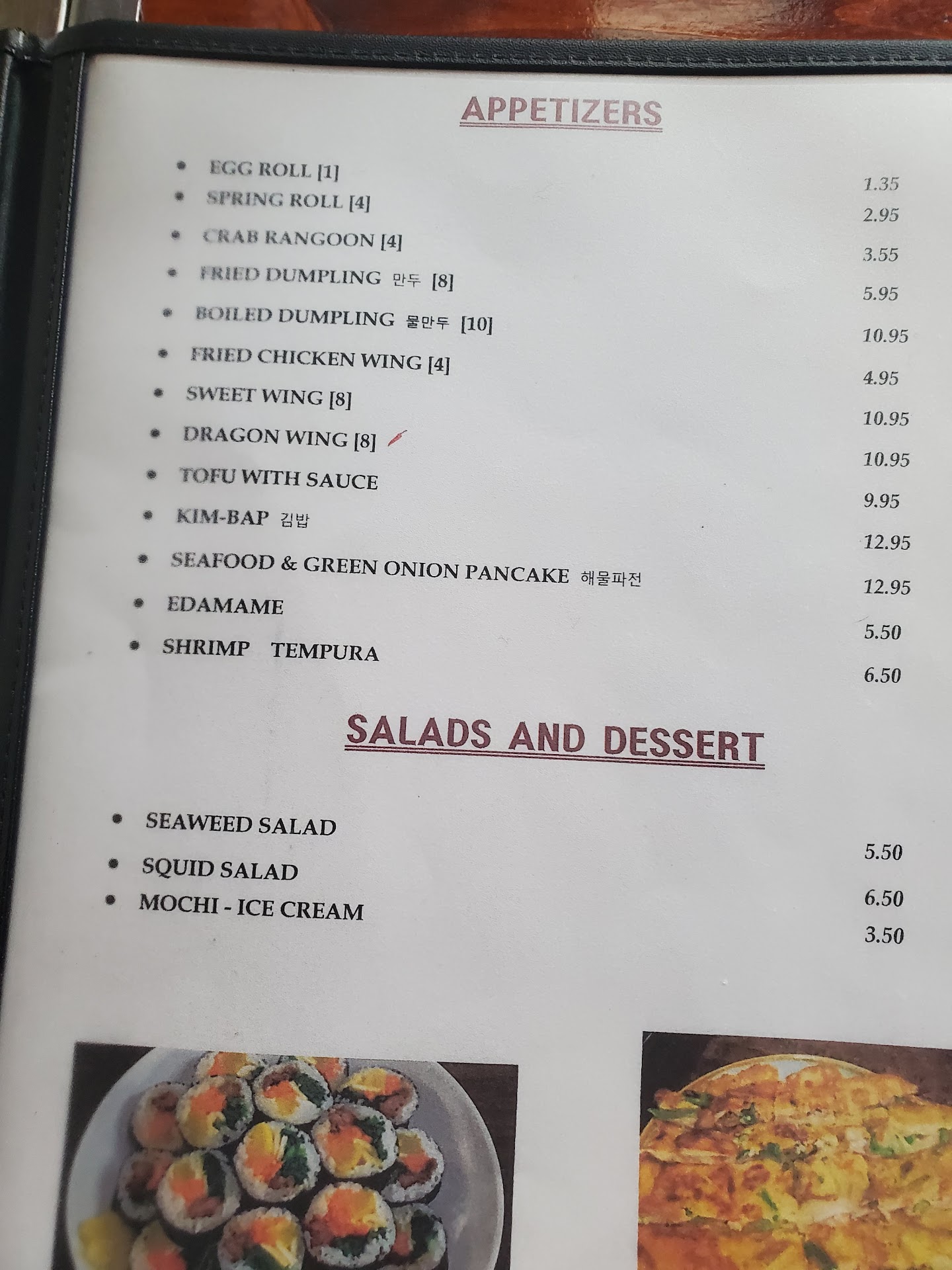 I've never had korean food. We came across this place by accident and decided to try it out. Due to the area changing restaurants so much we werent expecting much. But men, this is one of my favorite places in omaha. We've been there often, always greeted by friendly staff and courteous. The food is amazing. And it let's you bond with people your out with by sharing side dishes. We always get the crab ragoon and egg rolls to share as a family before the meal and they are some of the best in omaha. My favorite dishes are galbi ( beef rib ) and sweet and sour ( not your typical red sauce you may be use to). And I love pairing it with that pancake. You usually order a meal and depending on what you order are often accompanied with different sides to share with the family my favorite is the pancake and the kimichi. My least favorite is the brocolli its just bland compared to the other dishes.. They also have hibachi which I havent used only because I can never debate between my two favorite dishes. The food doesnt take along time to come out and it was definitely a new experience we love going here! They are a little pricey , but worth it. The servers are phenomenal I've yet to ever ask for a refill because they're always ahead of the game.
