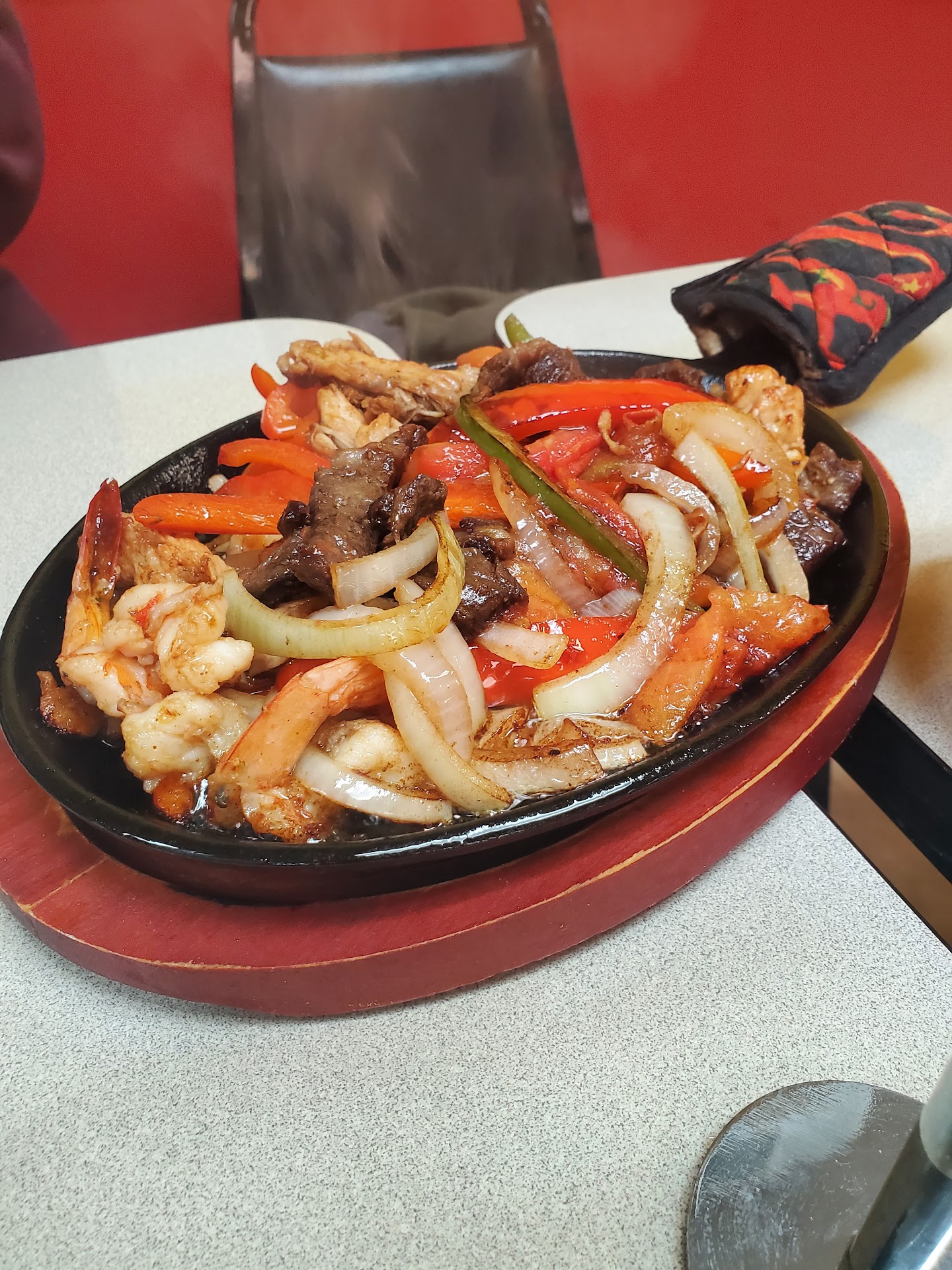 Service was a little slow. Appetizers (Papusa with cheese and jalapenos) came out after my entree and wasn't hot at all. The chips and frijoles was good. Chips were a little over done.