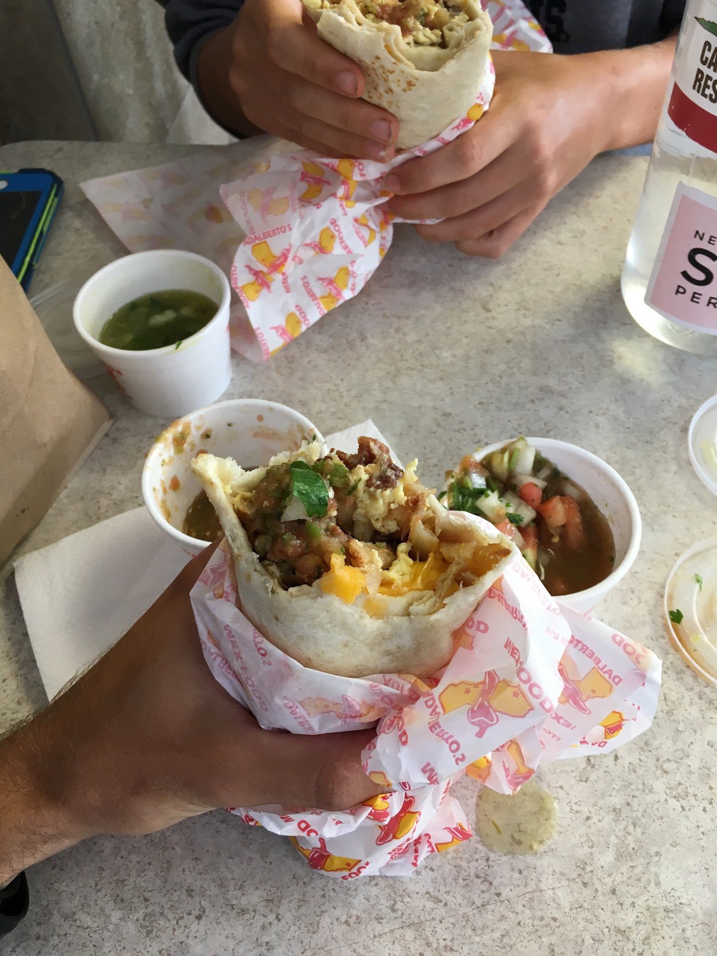 Immediately I identified potential as two classy businessman stepped out with smiles ear to ear. We got bacon breakfast burritos. While waiting we discovered an all you can eat chip station and the freshest salsas I've ever seen. Obviously, I indulged.
