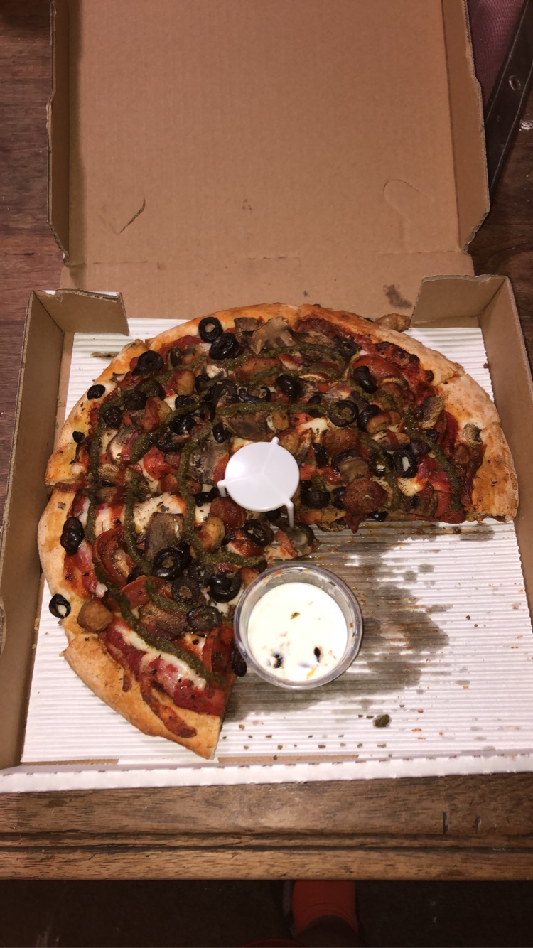 I ordered a custom personal pizza online for pick up. A little 8 inch pizza had the perfect crust, including the thickness (I ordered original). They absolutely did not skimp on the toppings, which were piled high. The roasted garlic are whole cloves!!! I love that I was able to order arugula and pesto drizzle after the pizza baked. I have never had such a loaded up personal pizza and could only eat half of it, getting two meals from an already very reasonably priced pizza, especially considering the number of toppings I requested.