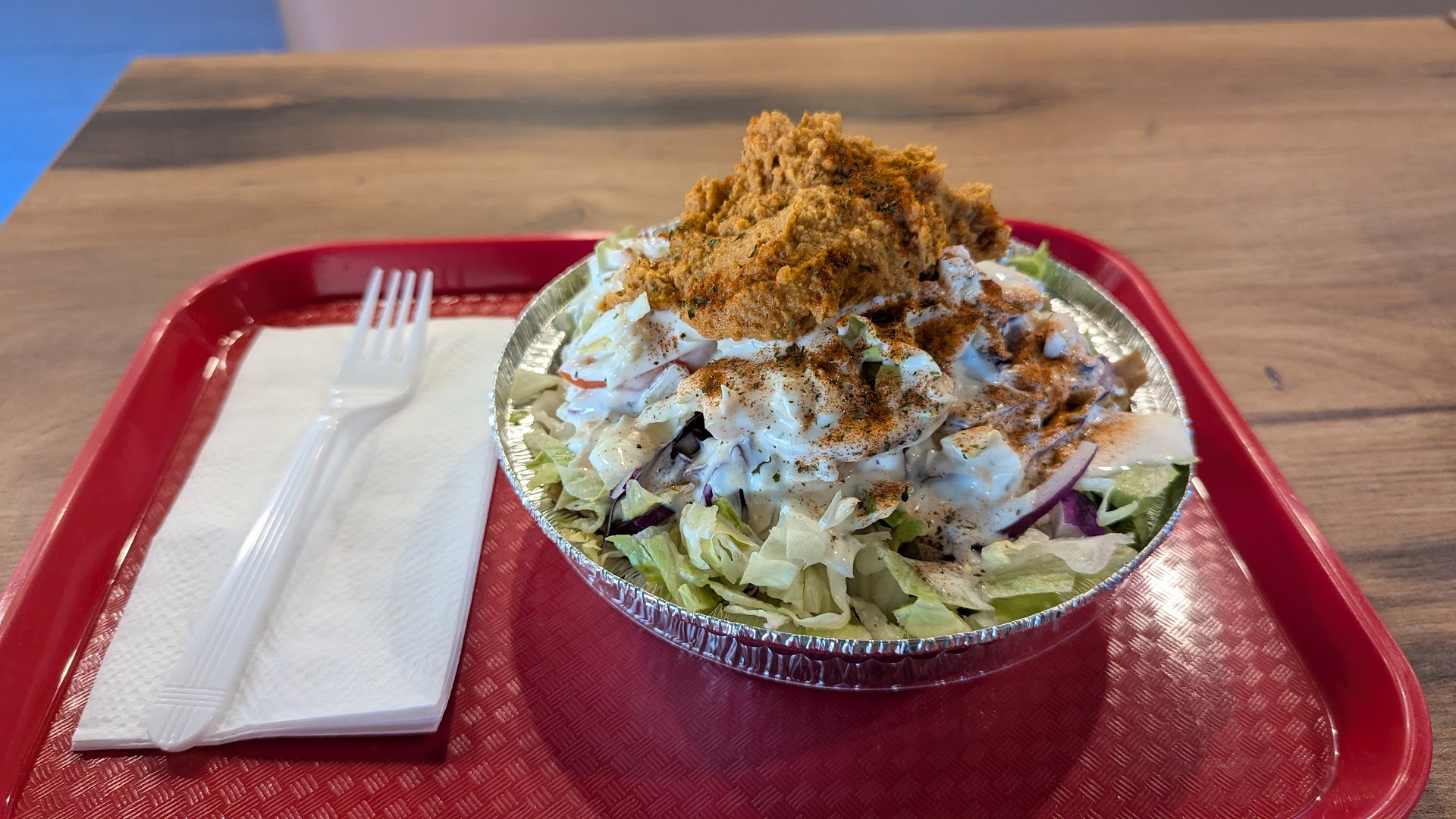 The chicken was juicy and delicious and well seasoned! It came with a generous amount of rice, probably 1/2 cup of hummus, half a pita bread, a small salad, topped with tzatziki sauce. The pita bread was perfectly made, crispy on the outside but fluffy in the middle. I only ate half and saved the other half for a lunch.