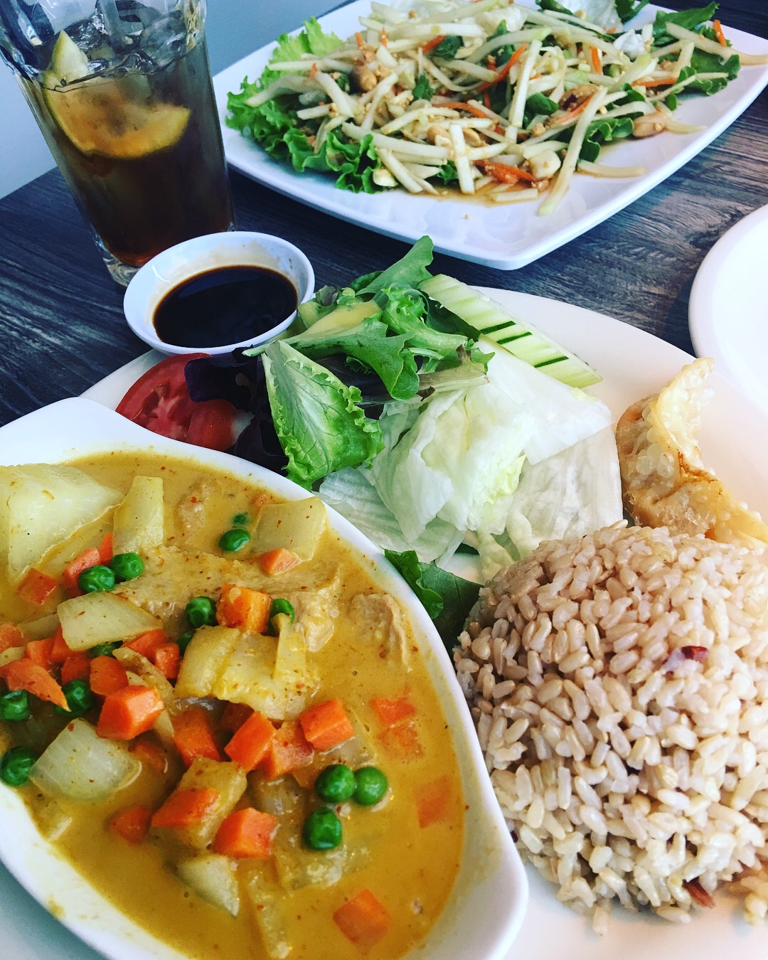 We had the mint noodles with "beef" , green beans w "pork" and the orange "chicken" soy Thai iced coffee,and fried banana with vegan green coconut ice cream. Oh and a sub standard hunk of sticky brown rice.