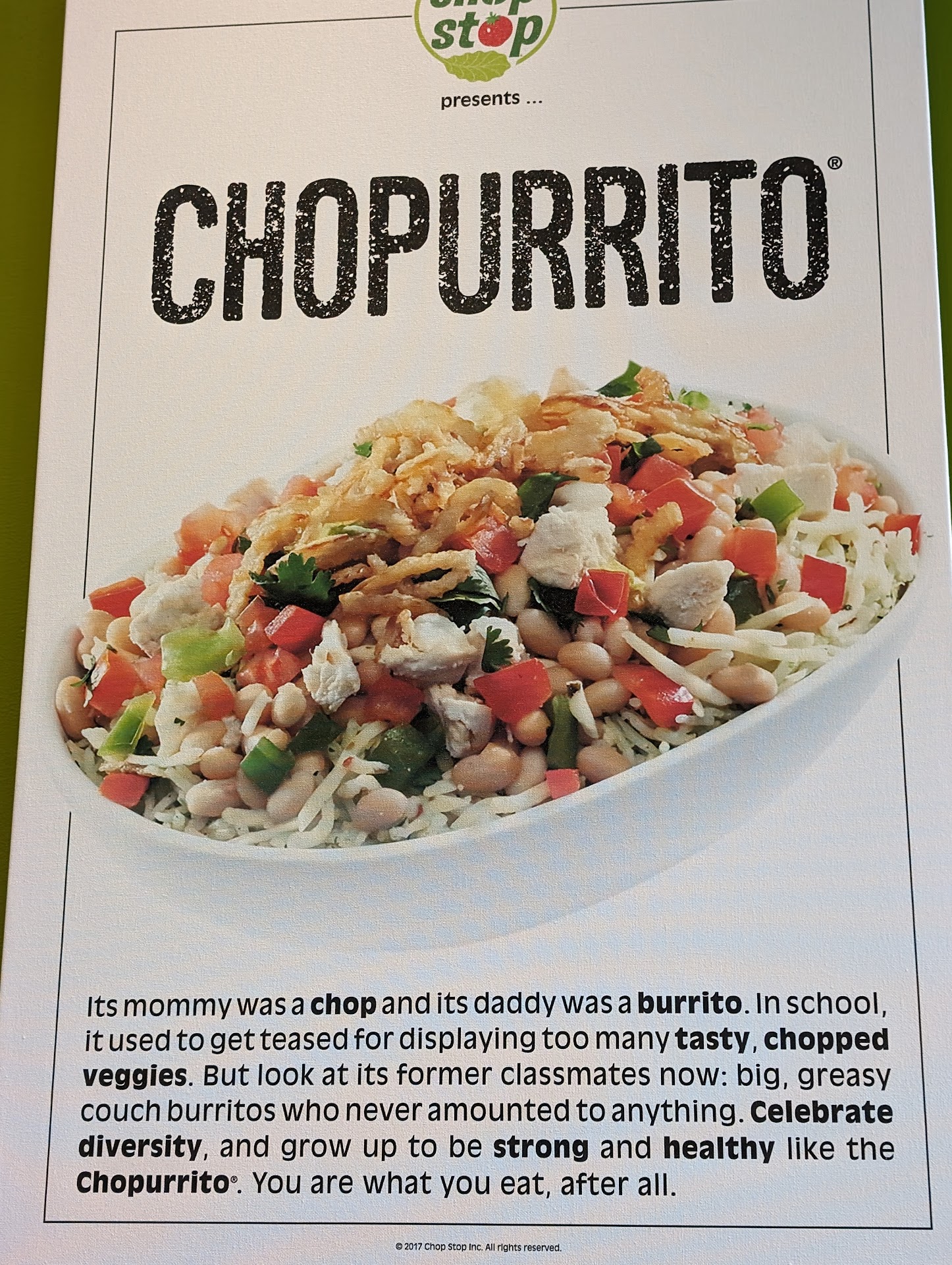 The advertisement reads "Its mommy was a chop and its daddy was a burrito. In school, it used to get teased for displaying too many tasty, chopped veggies. But look at its former classmates now: big, greasy couch burritos who never amounted to anything. Celebrate diversity, and grow up to be strong and healthy like the Chopurrito®. You are what you eat, after all."