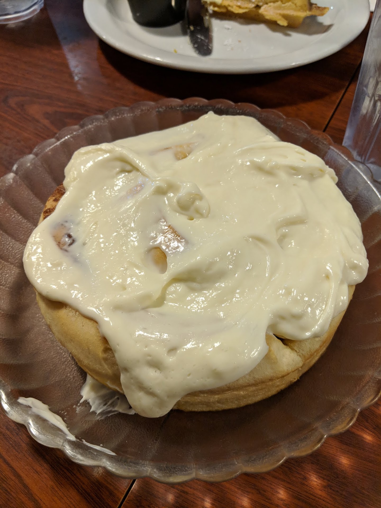 Cinnamon Roll - It's gigantic, and had less cinnamon, and more roll - Topped with a more cream chesse (not too sweet frosting), good for sharing.
